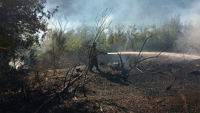 Firefighters Thursday evening were battling a brush fire in the bed of the Ventura River that’s grown to 17 acres, and crews were working overnight to prevent the blaze from spreading into nearby oilfields.