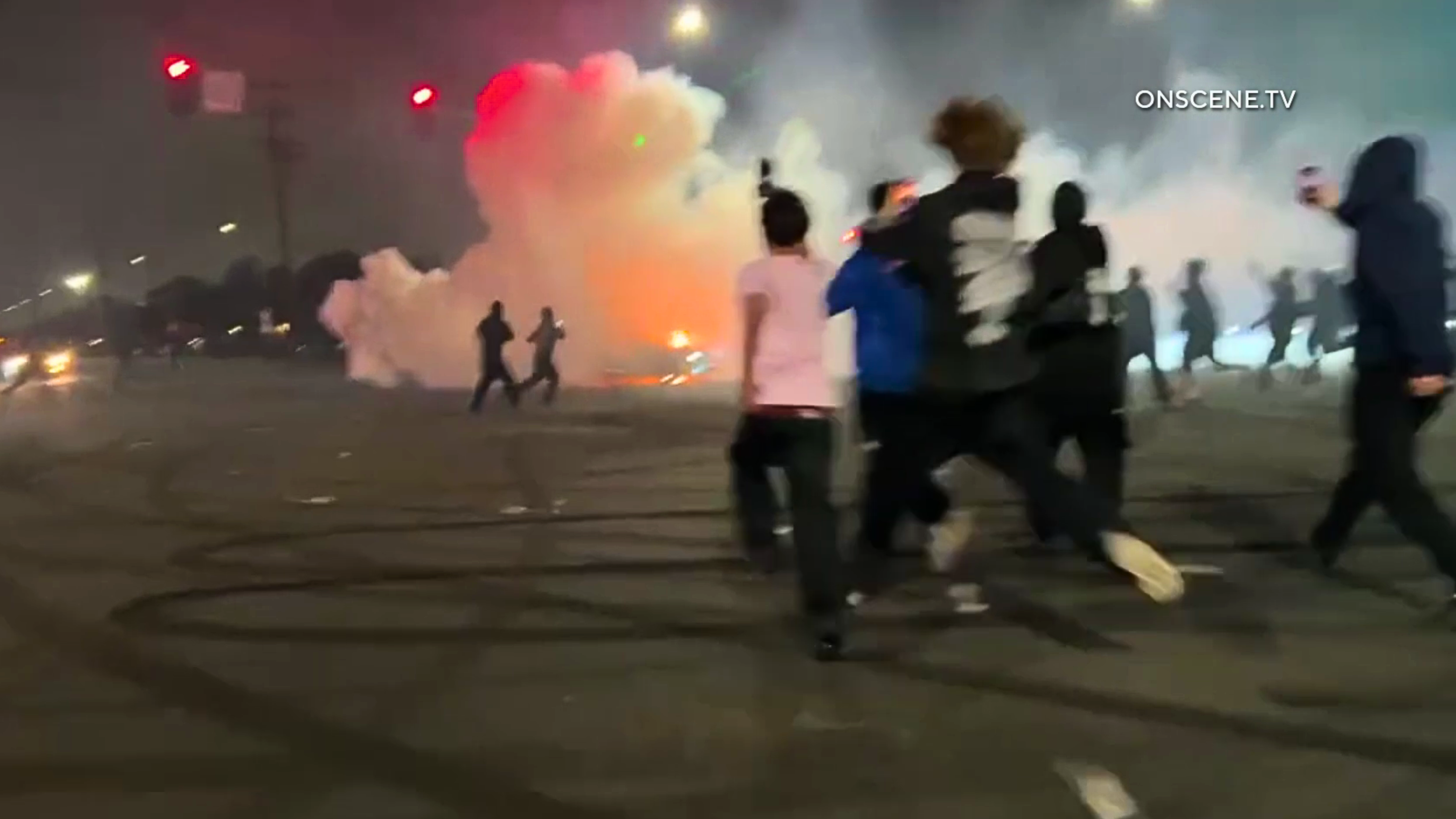 Two more street takeovers were also reported in East Los Angeles around the same time, and another incident occurred in Compton, where a large crowd with laser pointers gathered around multiple cars performing stunts in an intersection, according to news video service OnScene.TV.