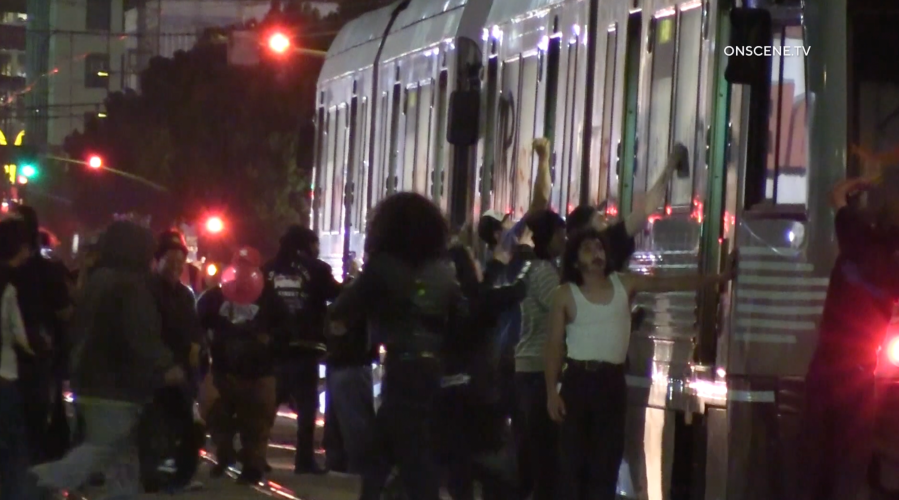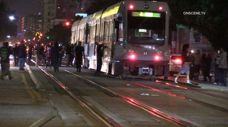 Video from the scene obtained by KTLA shows dozens of vandals punching the slow-moving Metro train and spray painting it as it came to a halt.