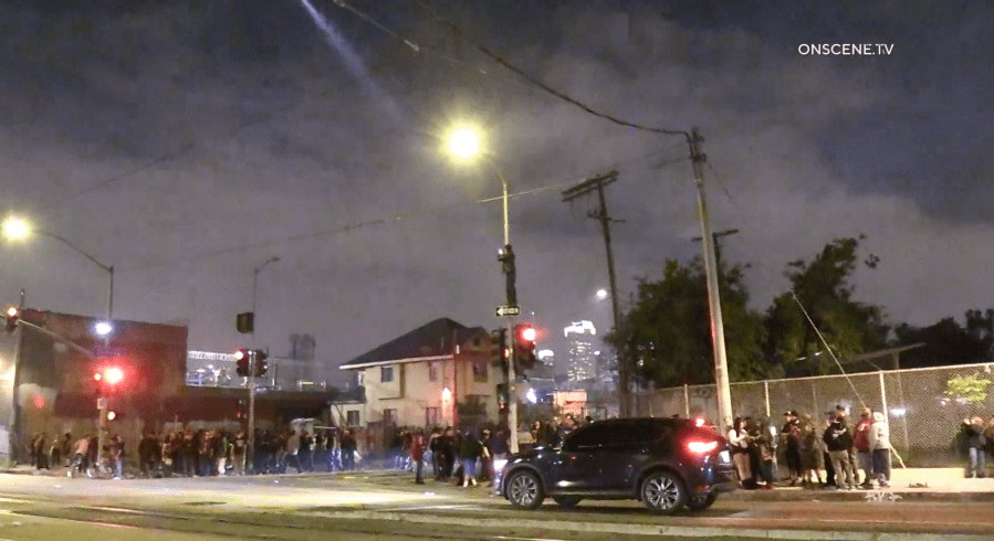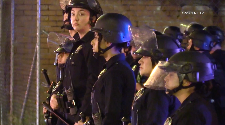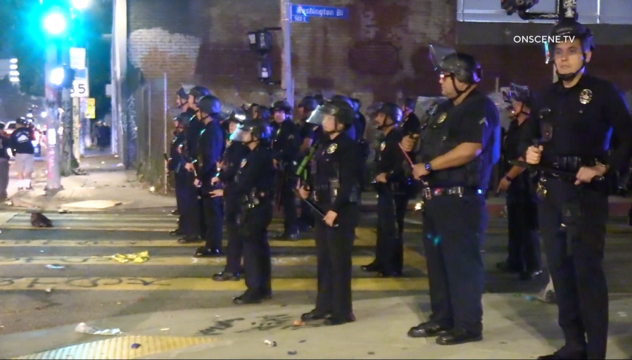 Officers, who were positioned in the area in riot gear, eventually declared an unlawful assembly and formed a skirmish line. By 1 a.m. Sunday, the group had cleared out of the area, the LAPD spokesperson said.