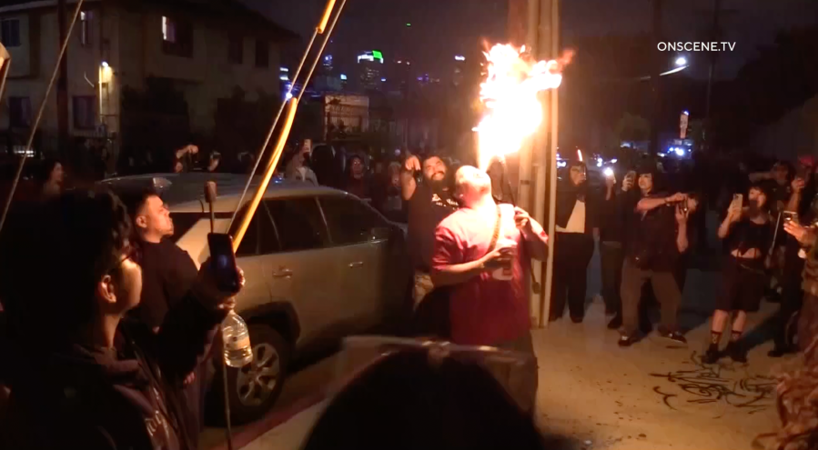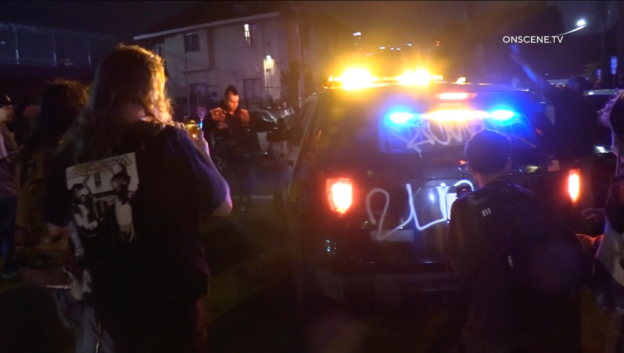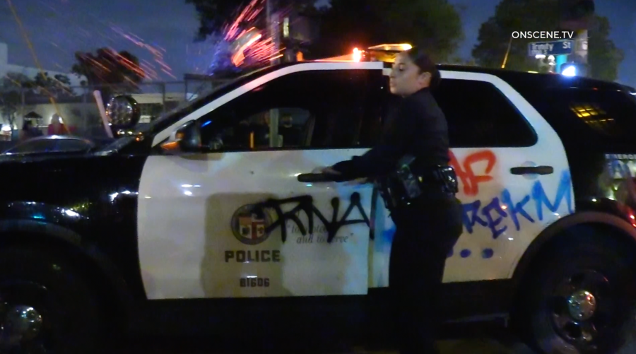 Several individuals were also seen vandalizing an LAPD squad car – even posing for pictures in front of it, shooting fireworks at it, kicking it and spray painting it as the officers started to drive away. Many of those who were not actively engaging in the vandalism were recording the chaos on their cell phones.