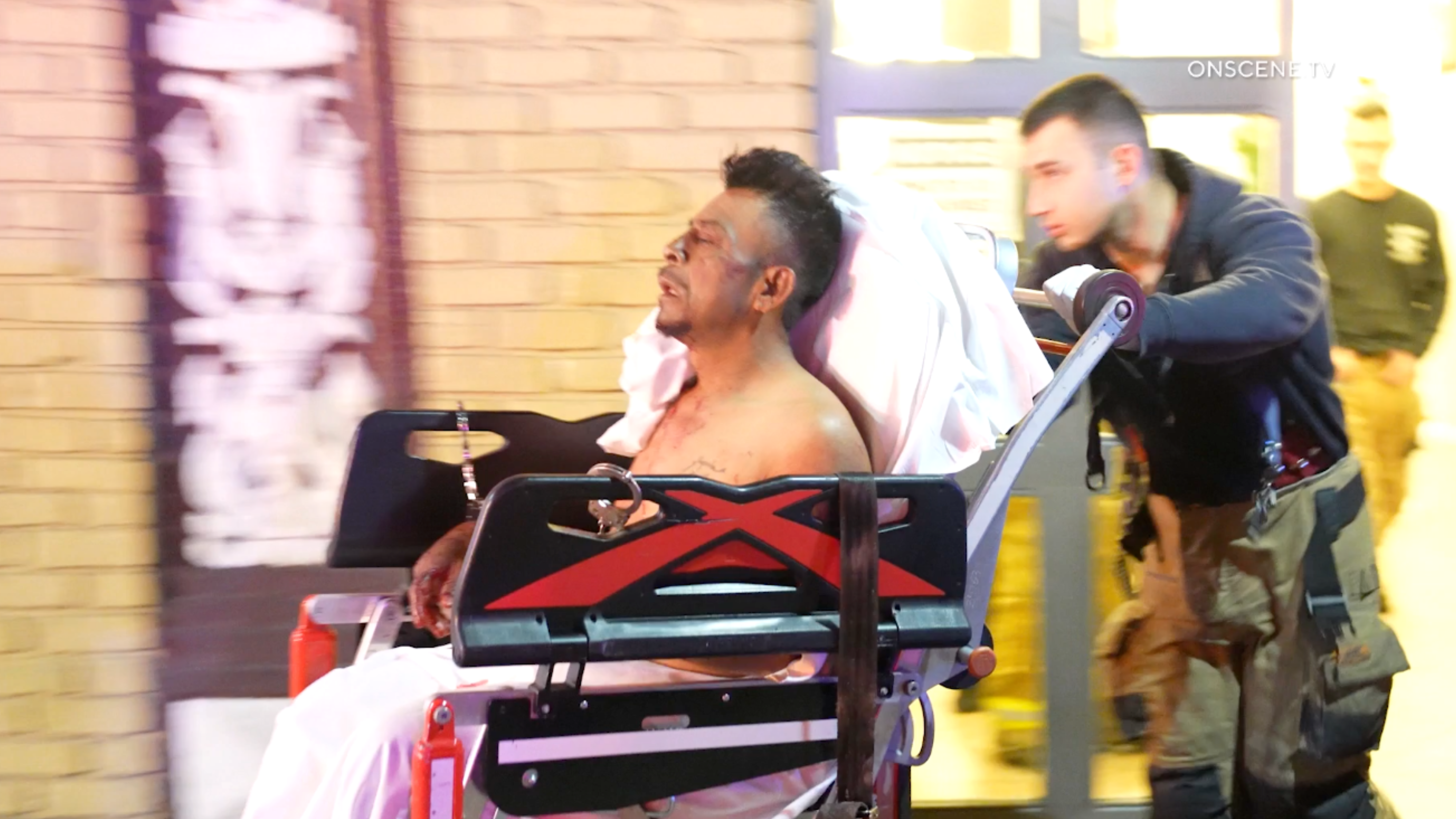 Video showed a bloodied man handcuffed to a wheelchair being taken from the hotel for medical treatment.