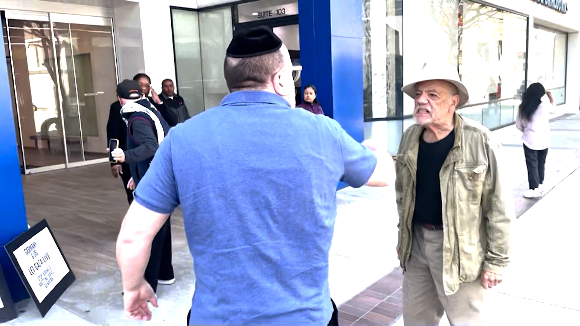 A shouting match nearly turned violent when at least two men disrupted a pro-Palestinian demonstration outside the German consulate in Los Angeles on Monday.