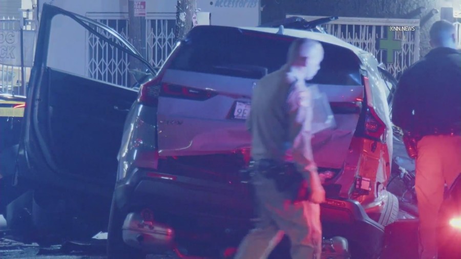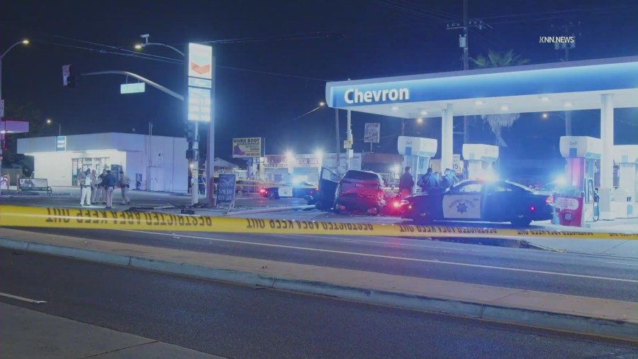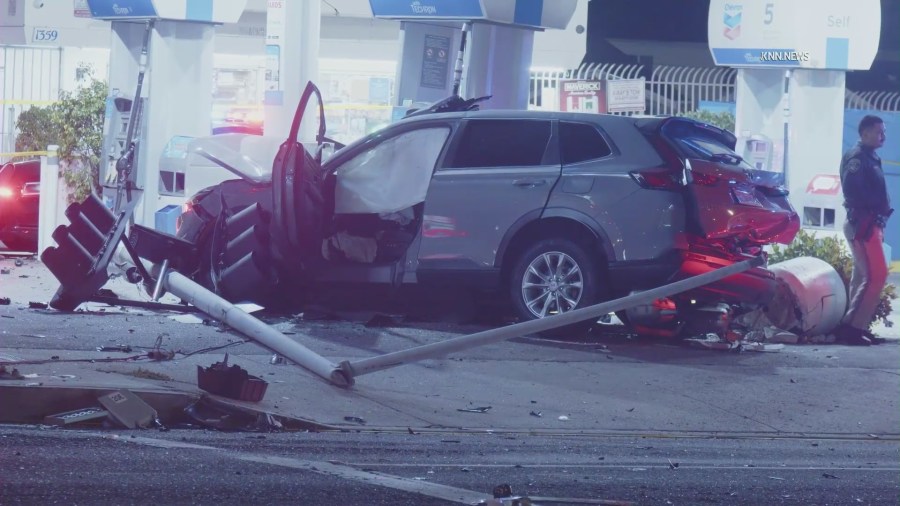Video from the scene obtained by KTLA shows one of the two vehicles involved in the wreck, a gray Honda SUV, came to rest next to a gas pump after taking out a traffic light. The other vehicle involved, a silver Buick SUV, was seen in the middle of the roadway.