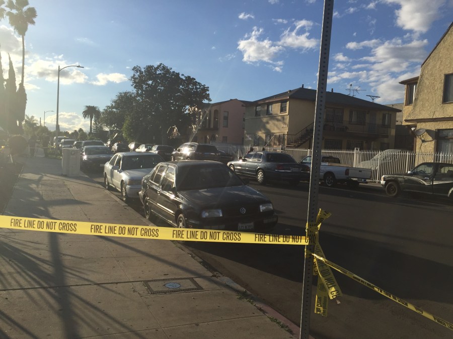 A man was injured in an exchange of gunfire with LAPD officers on Feb. 23, 2015. (Credit: Kareen Wynter / KTLA)