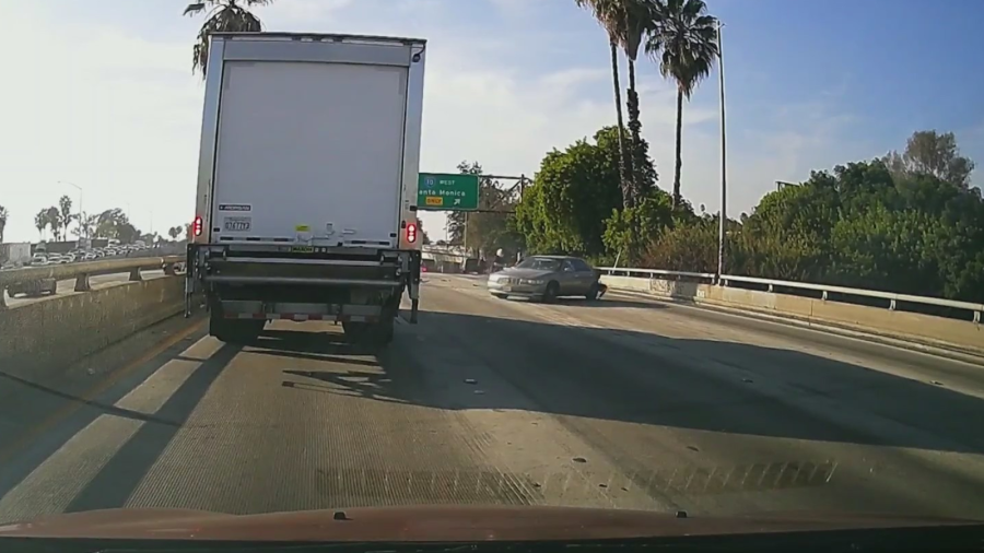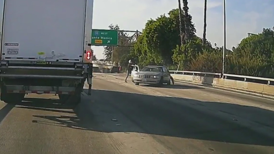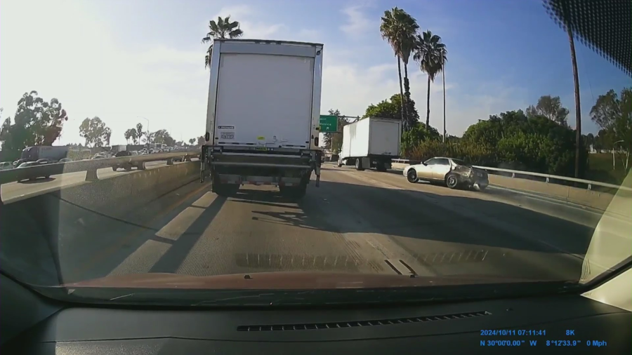New dashcam video obtained exclusively by KTLA shows the victim’s damaged Cadillac swerving erratically as they tried to make a U-turn to get away from the suspects.