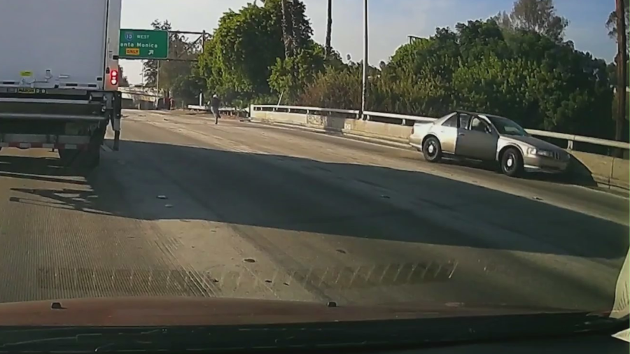 The Cadillac’s tires can be heard screeching as they came to an abrupt halt and started reversing, but as they began driving the wrong way on the freeway, the suspect pulled out a gun and fired multiple shots.