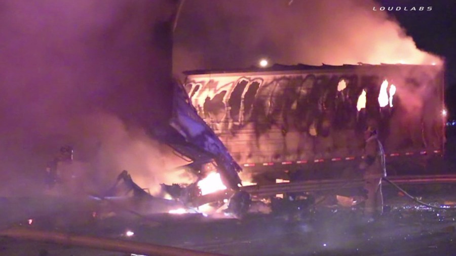 Driver Killed After Big Rig Hits Pole, Bursts Into Flames on 10 Freeway in Fontana