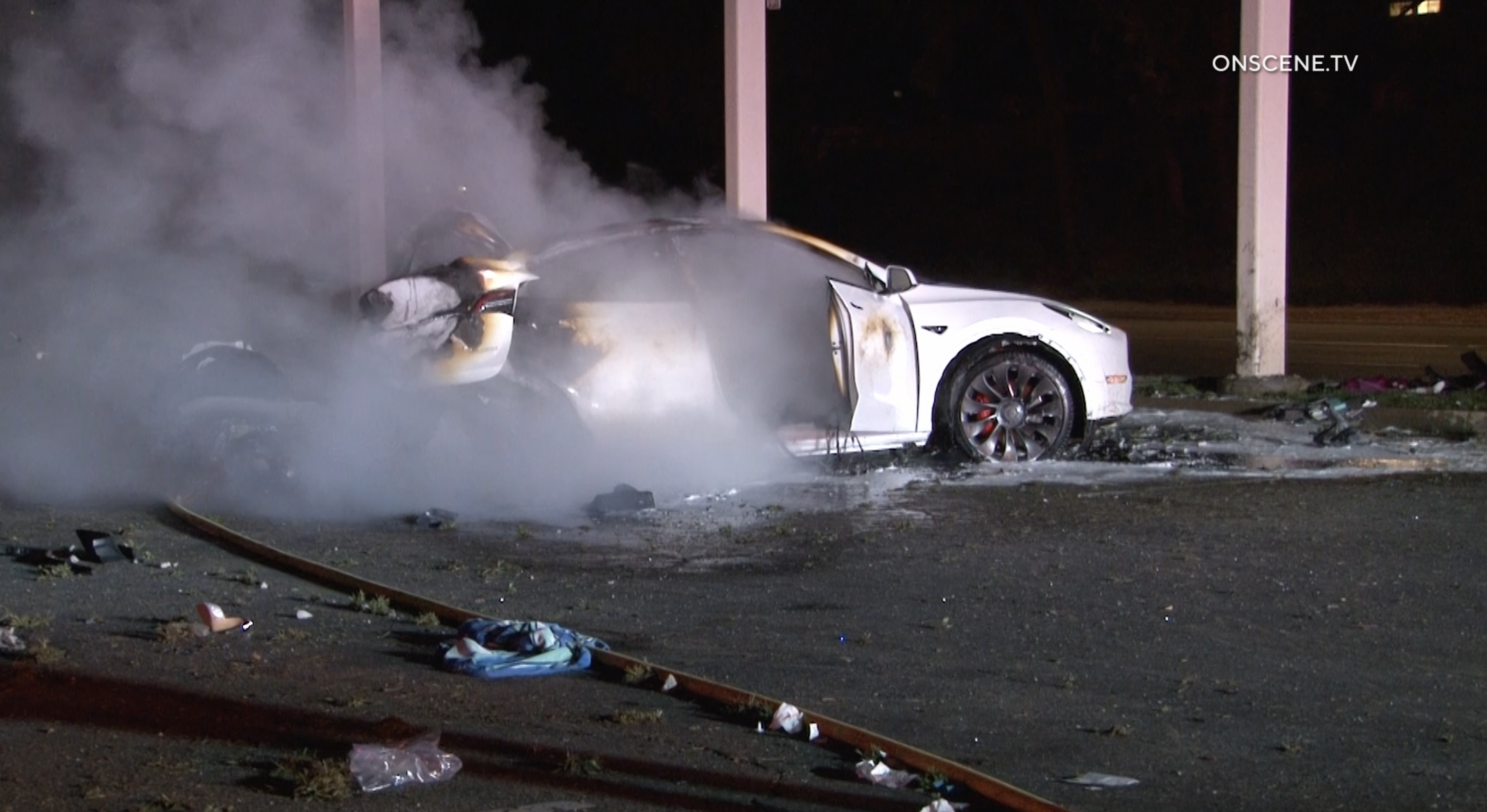 Footage of the scene showed the burnt out wreckage under a carport in the school’s parking lot. A portion of the car’s rear end appeared to be hanging off the vehicle as firefighters worked to extinguish flames still showing beneath the white four-door Tesla.