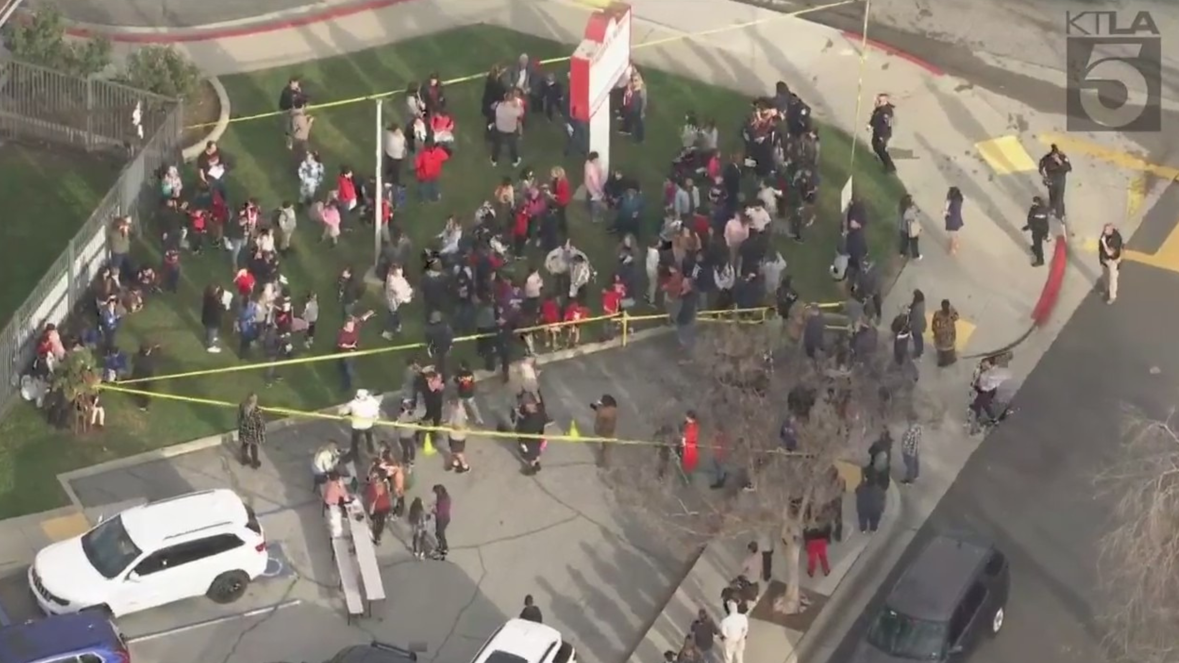 Several people, possibly students and staff, were still standing in an area marked off by yellow tape.