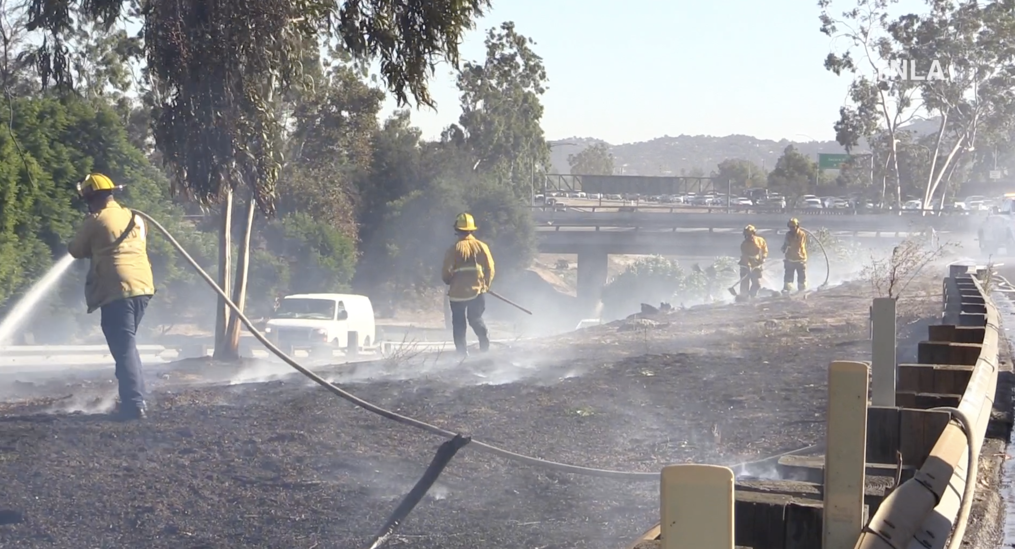 In North Hollywood, firefighters responded to a quarter-acre brush fire near the 170 Freeway at Victory Boulevard at around 2:15 p.m., LAFD said. With winds of 15 miles per hour, crews were fighting the flames from both the ground and air as there were multiple spot fires on either side of the busy freeway.