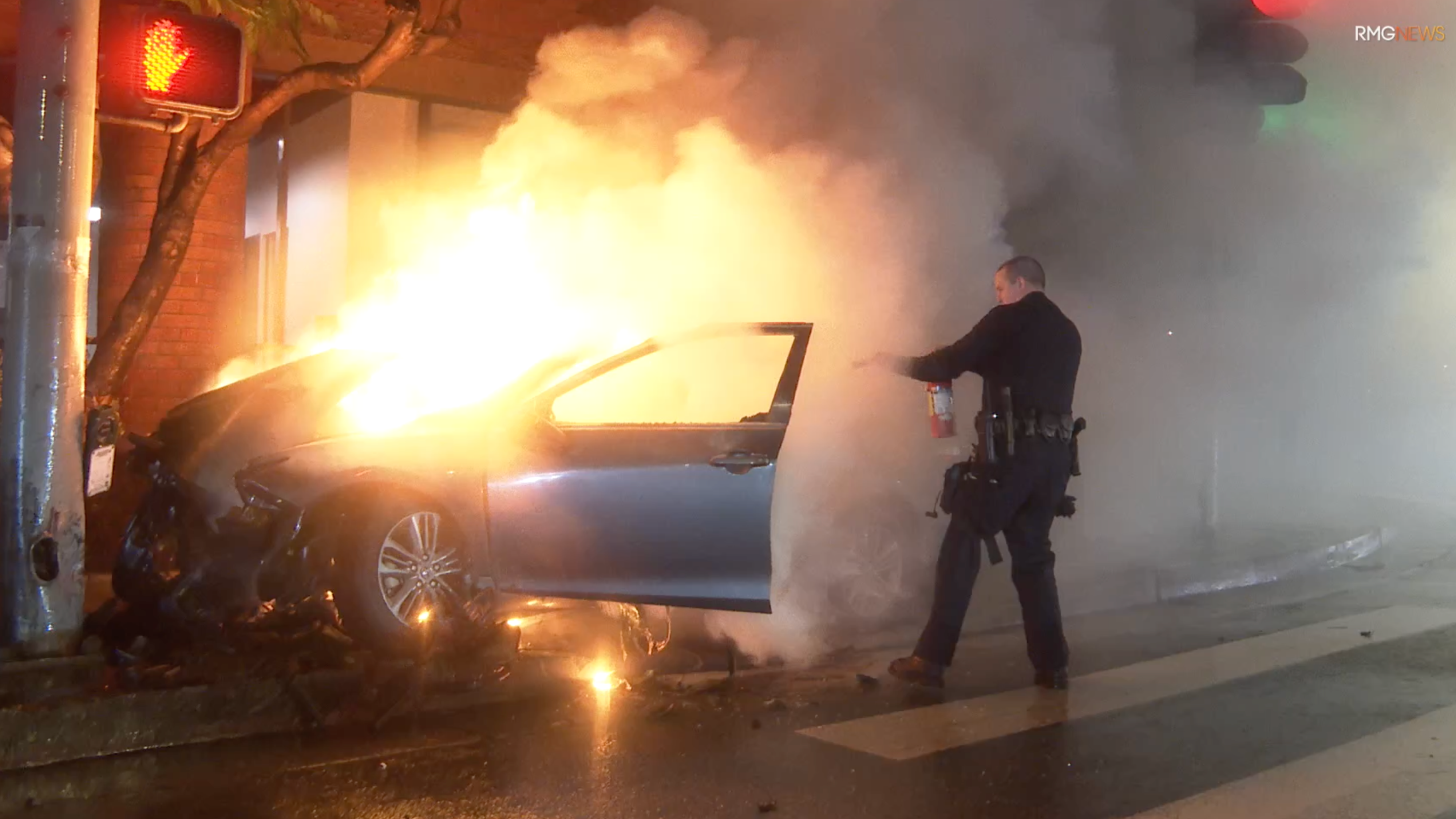 Video shows the car had burst into flames and was fully engulfed as officers tried to get the victims out.