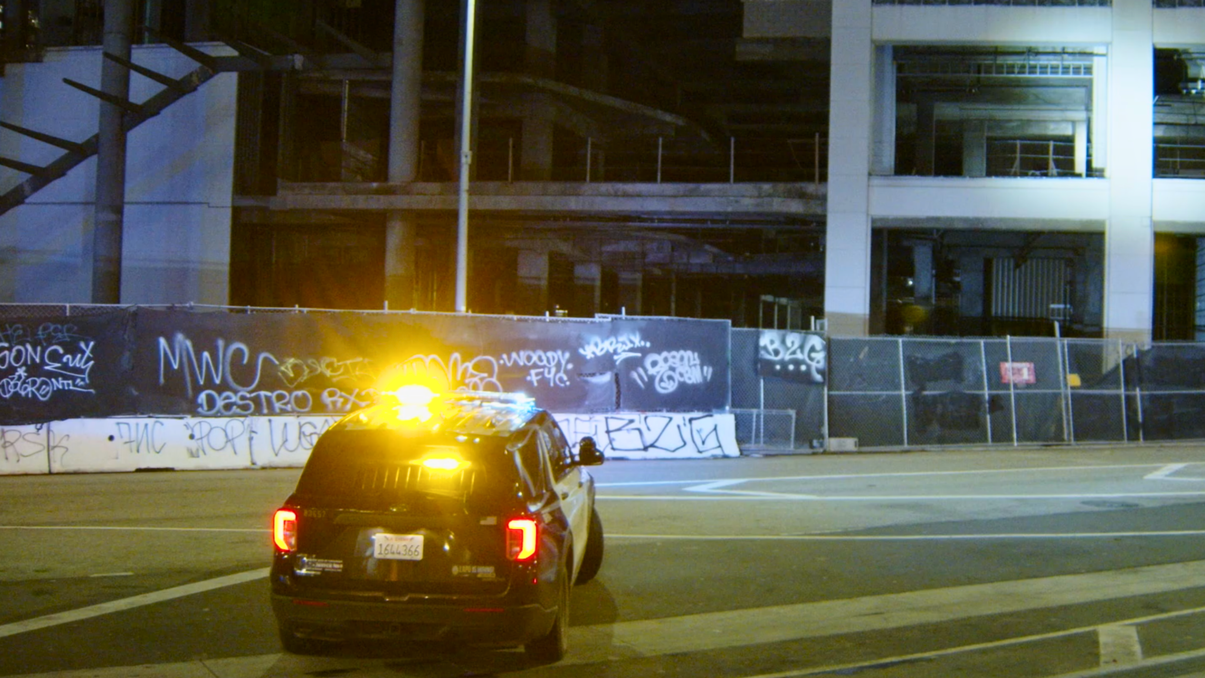 Video recorded Friday morning showed Los Angeles Police Department officers patrolling the perimeter of the skyscraper.