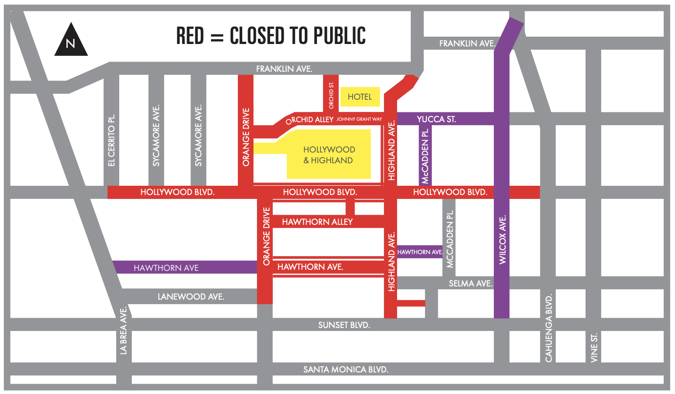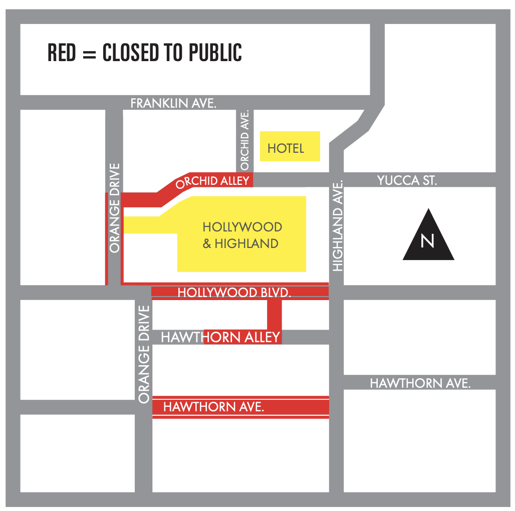 - Orange Drive closed from from Orchid Alley to Hollywood Boulevard from 6 a.m. Saturday to 6 a.m. Monday (except for local residents, local business access, and emergency vehicles.)