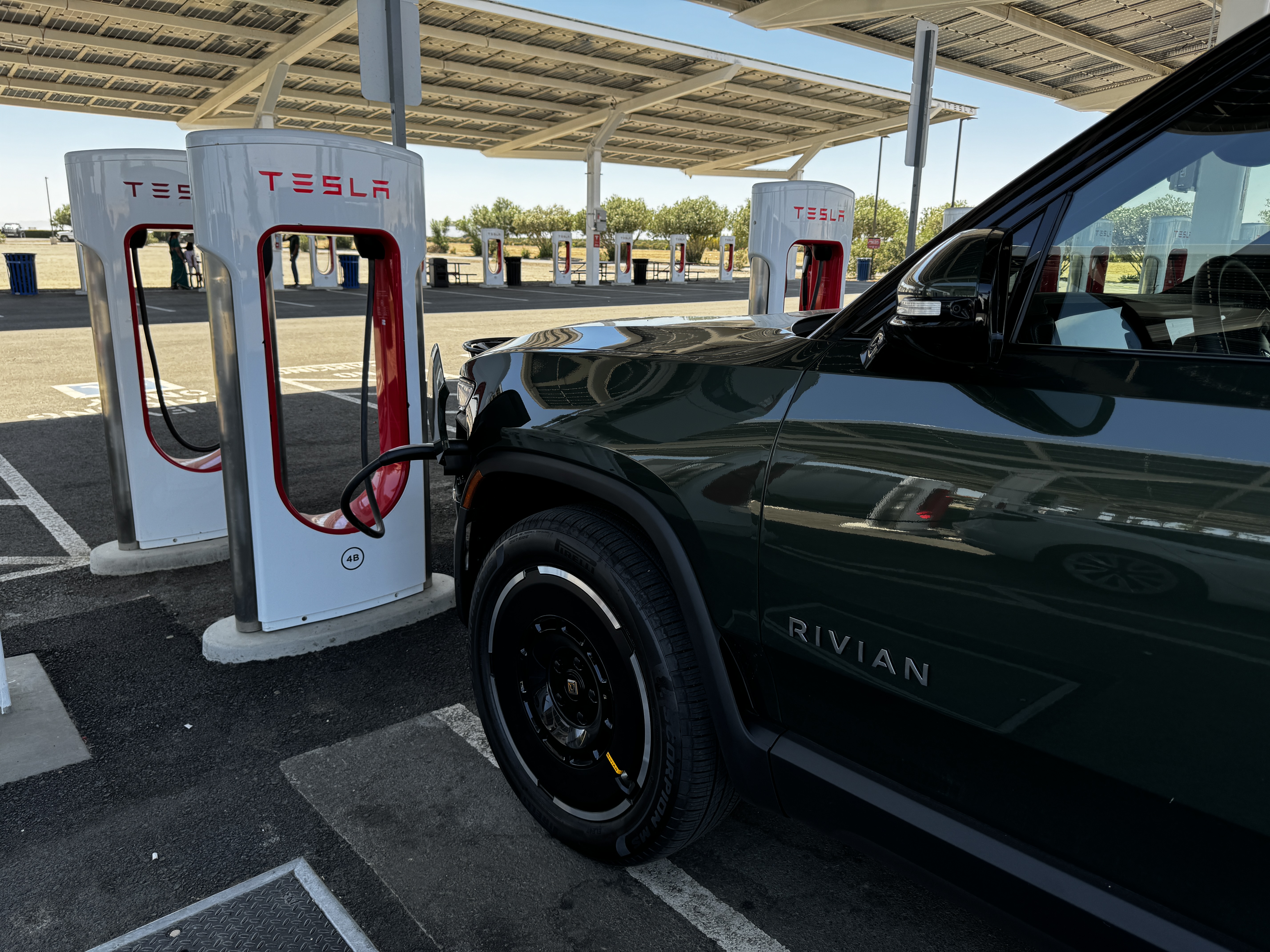 What’s unique about this trip is that the Rivian runs the latest software, which lets you charge at Tesla Superchargers.