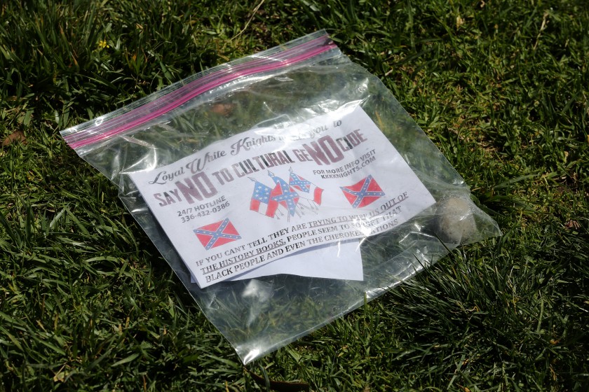 Social media posts showed flyers placed in plastic bags featuring the words “White lives do matter,” along with a drawing of a hooded figure and a burning cross beneath the words, the Orange County Register reported.