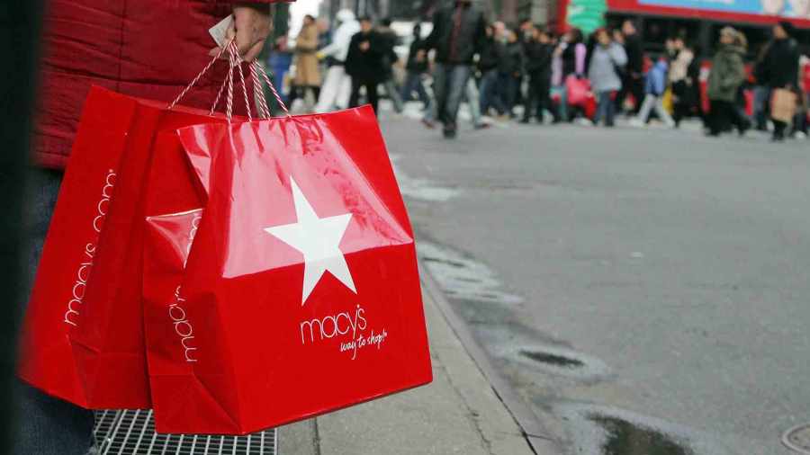 In this file photo, a post-Christmas shopper holds Macy's bags as other shoppers cross Seventh Avenue in New York City on Dec. 27, 2006. (Credit: Mario Tama/Getty Images)