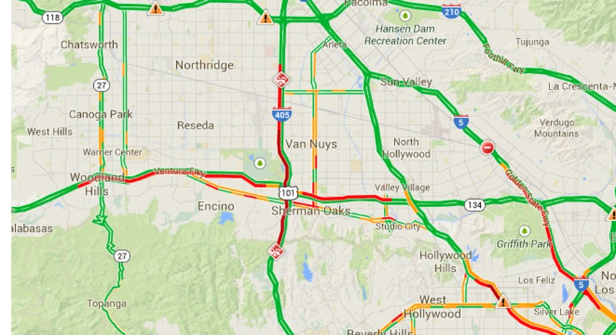 Traffic was backed up for miles on the southbound 405 Freeway for miles after a motorcyclist was killed in a crash on July 11, 2014. (Credit: Google Maps)