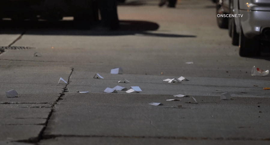 Video obtained by KTLA shows the victim’s body lying at the foot of a driveway under a white sheet as officers erected a white tent. Additionally, evidence markers and shell casings were scattered across the street.