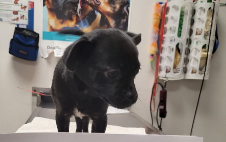 The black female mix puppy named Raisin is recovering well and will be available for adoption.