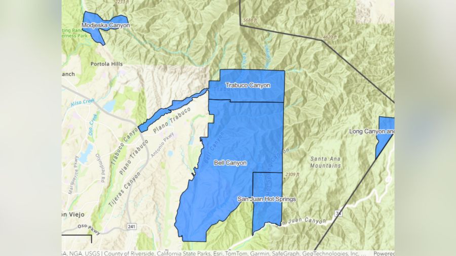 The O.C. Sheriff’s Department put the evacuation order into effect at 10 a.m. Tuesday for “areas in Trabuco Creek including the RC Airport, fire station, campground/park and school, Bell Canyon including Starr Ranch and Hot Springs Canyon including Lazy-W Ranch, due to possible debris flows along or near the Airport Fire burn scar.”