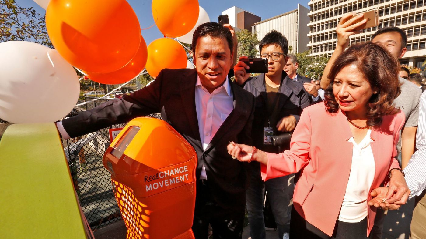 Ringed by television cameras and photographers, Los Angeles politicians grinned and plunked coins Thursday into the bright orange meter newly installed in Grand Park.