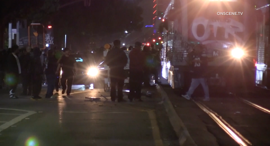 Several individuals were seen vandalizing an LAPD squad car. Video showed that one officer was nearly struck by something, possibly a drink, that was thrown from the crowd.