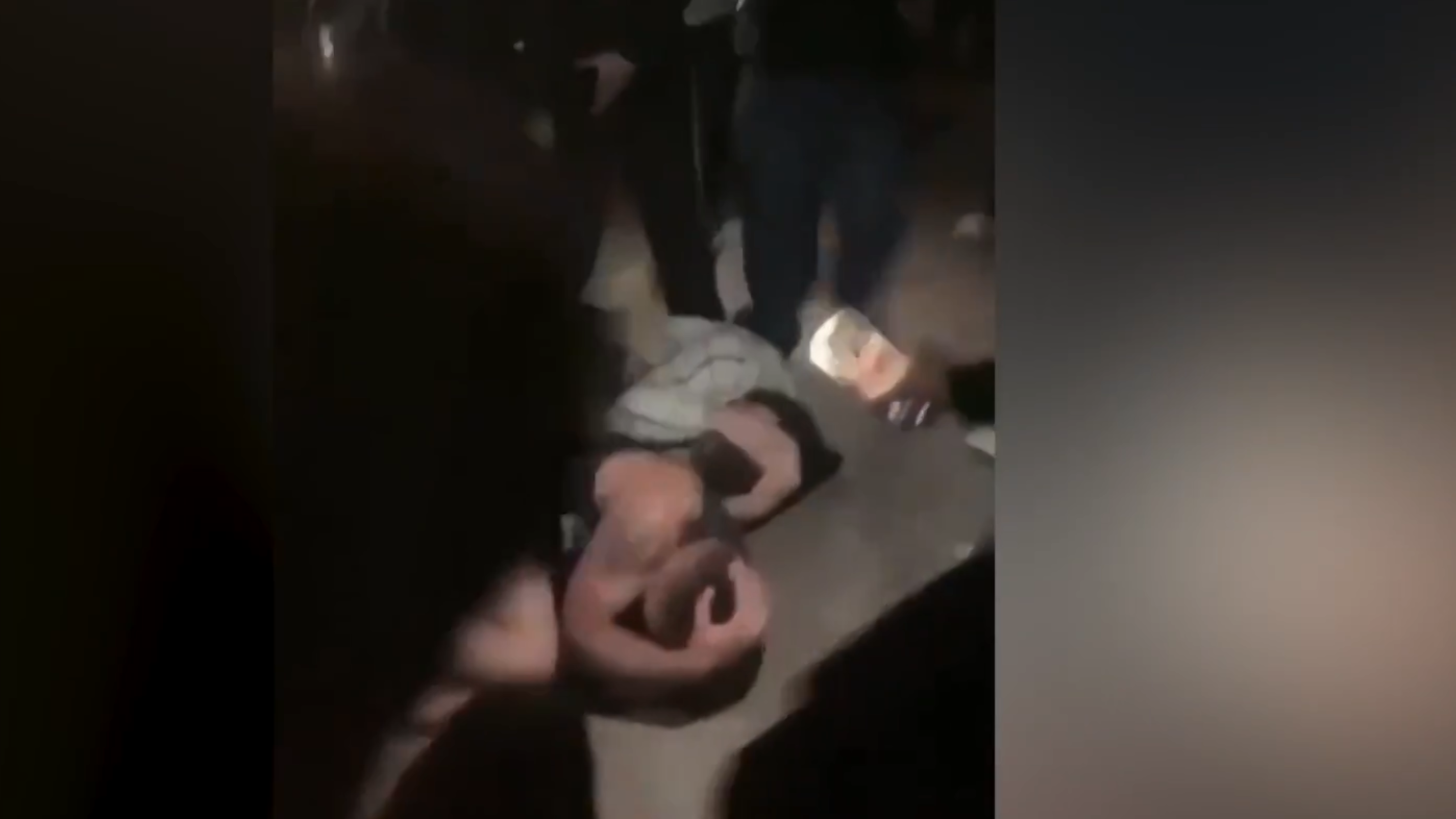 Later, the video shows two Marines curled up in the fetal position as they are punched and kicked by several crowd members.