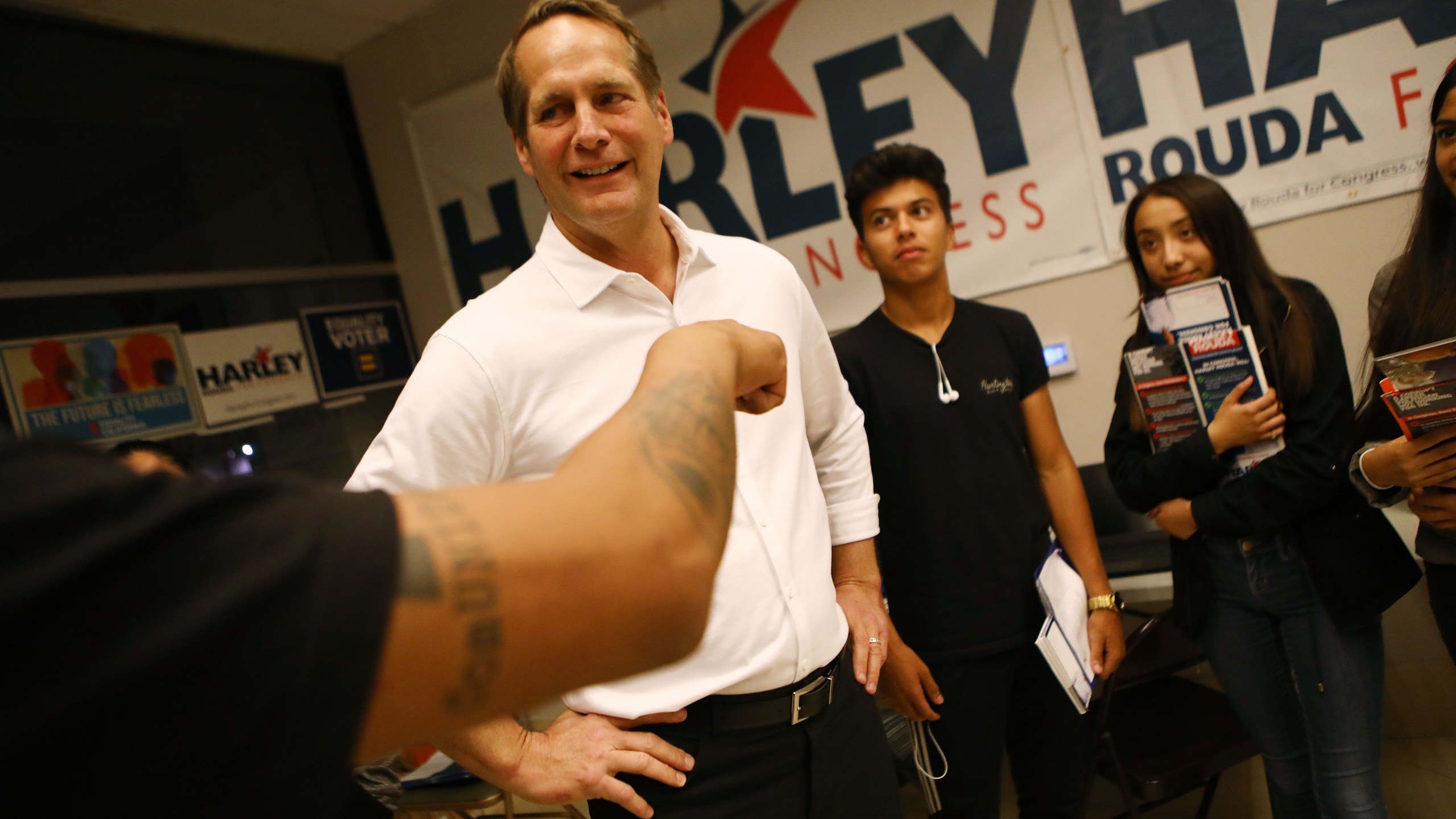 In the closely fought 39th Congressional District southeast of Los Angeles, Republican candidate Young Kim was joined by the GOP nominee for governor, John Cox, who pulled up to her campaign office in a lime-green bus splashed with the slogan, “Help is on the way.”
