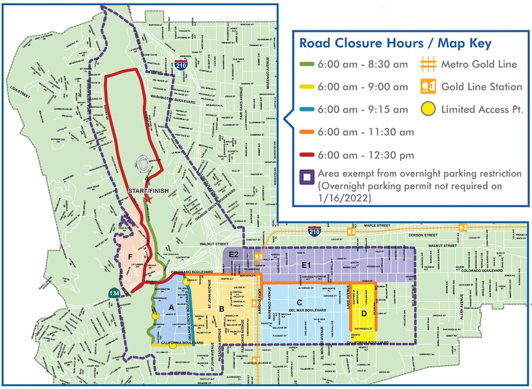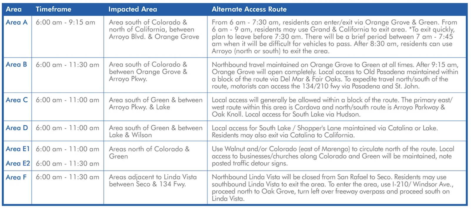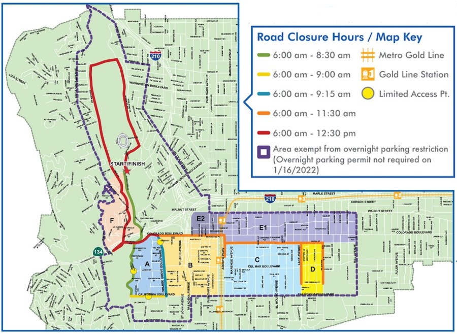 From 6 a.m. to 9:15 a.m., the area south of Colorado Boulevard and north of California Boulevard will be impacted between Arroyo Boulevard and Orange Grove.