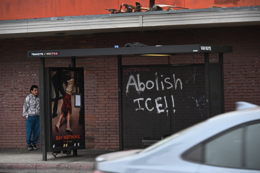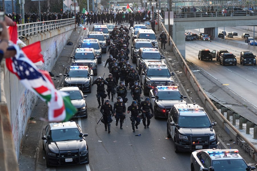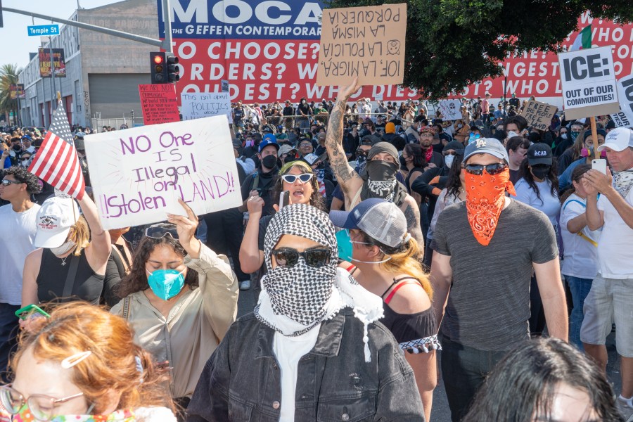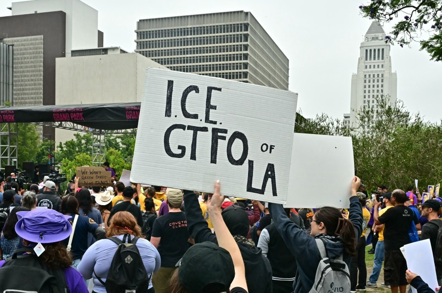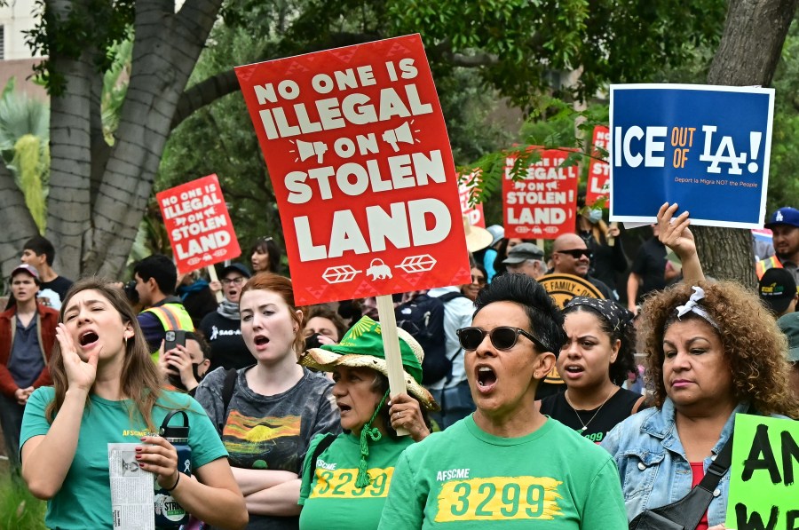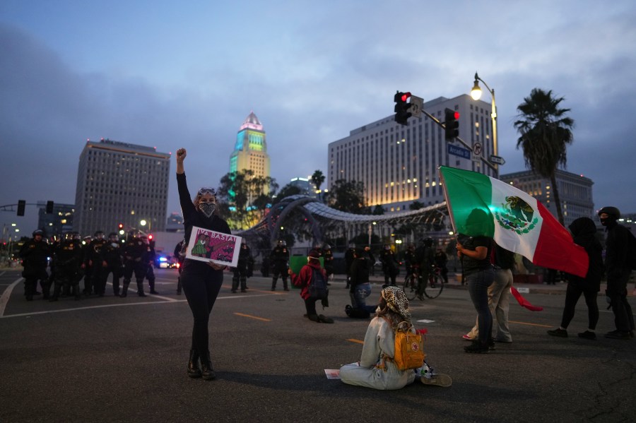 Just before 11:45 a.m., L.A. Mayor Karen Bass advised demonstrators to protest peacefully and follow in the city’s “proud history of peaceful protest for immigrants’ rights.”