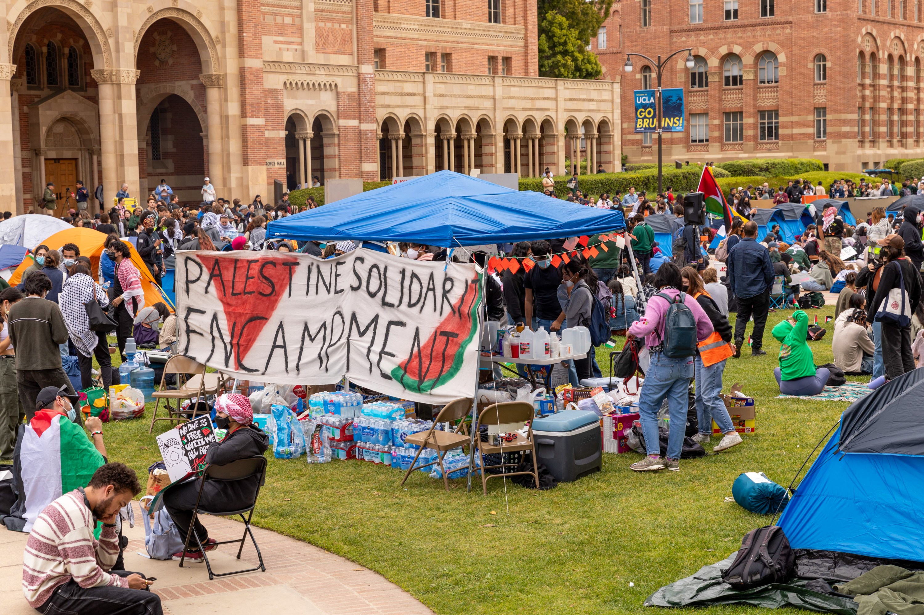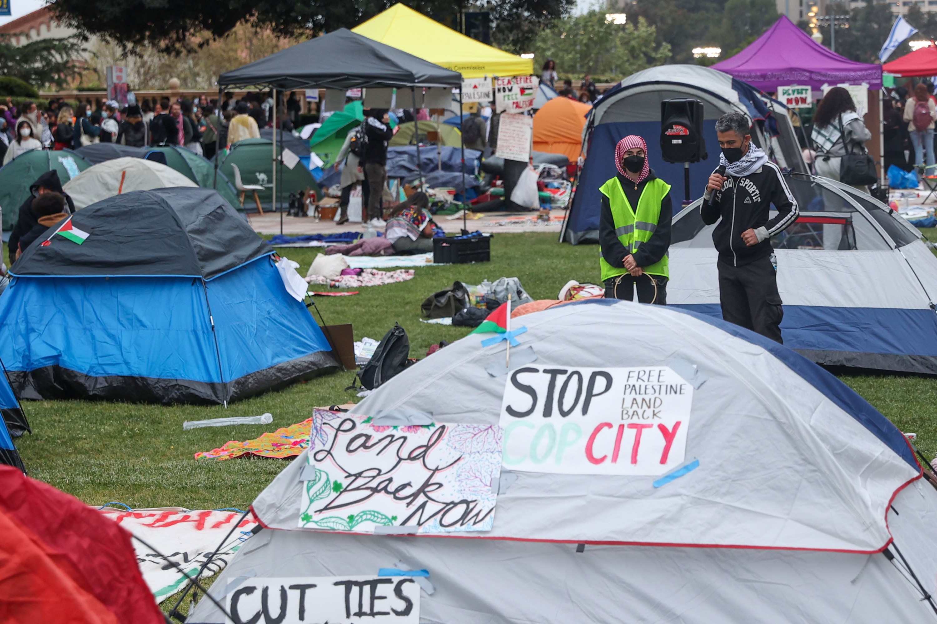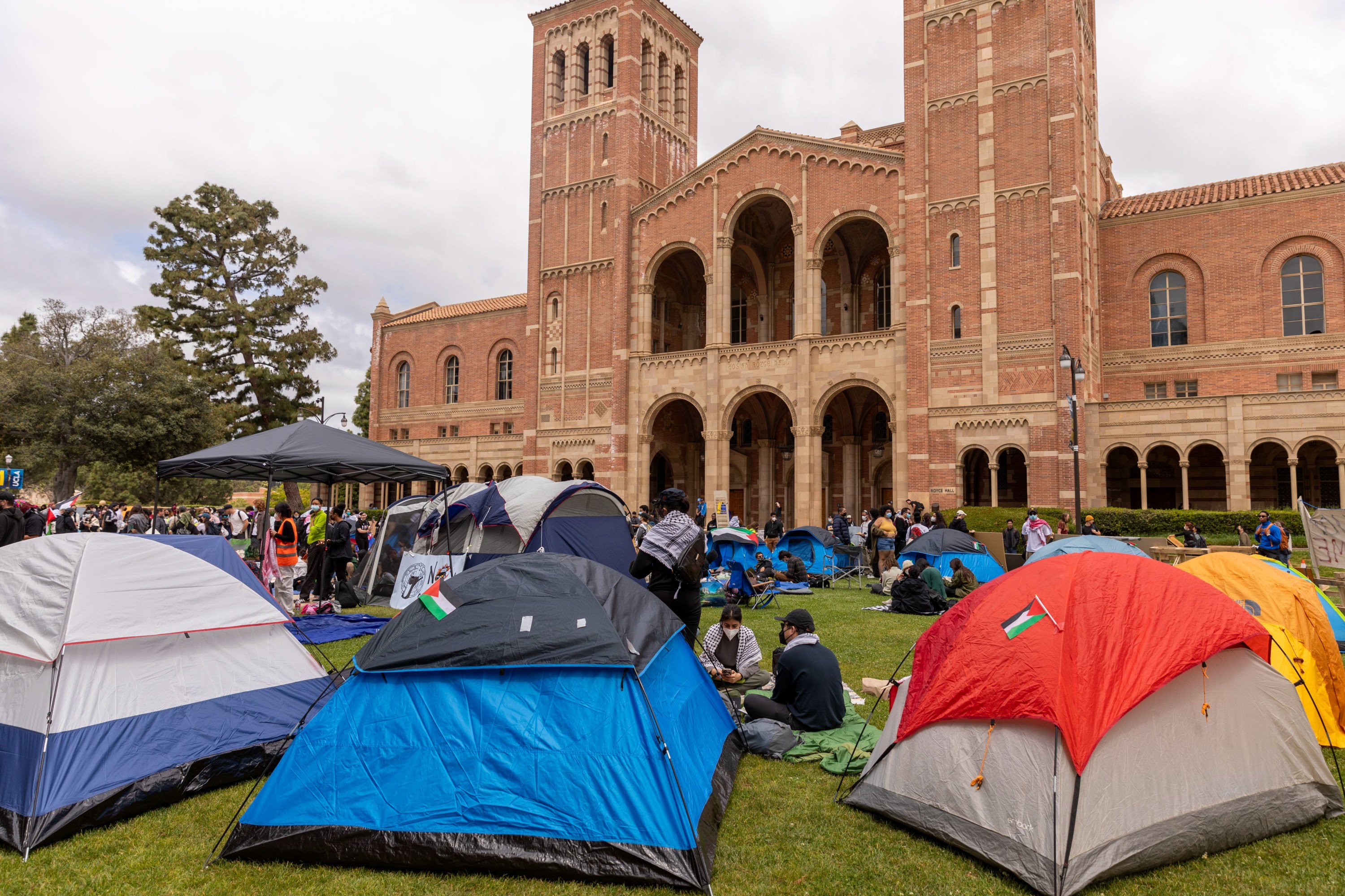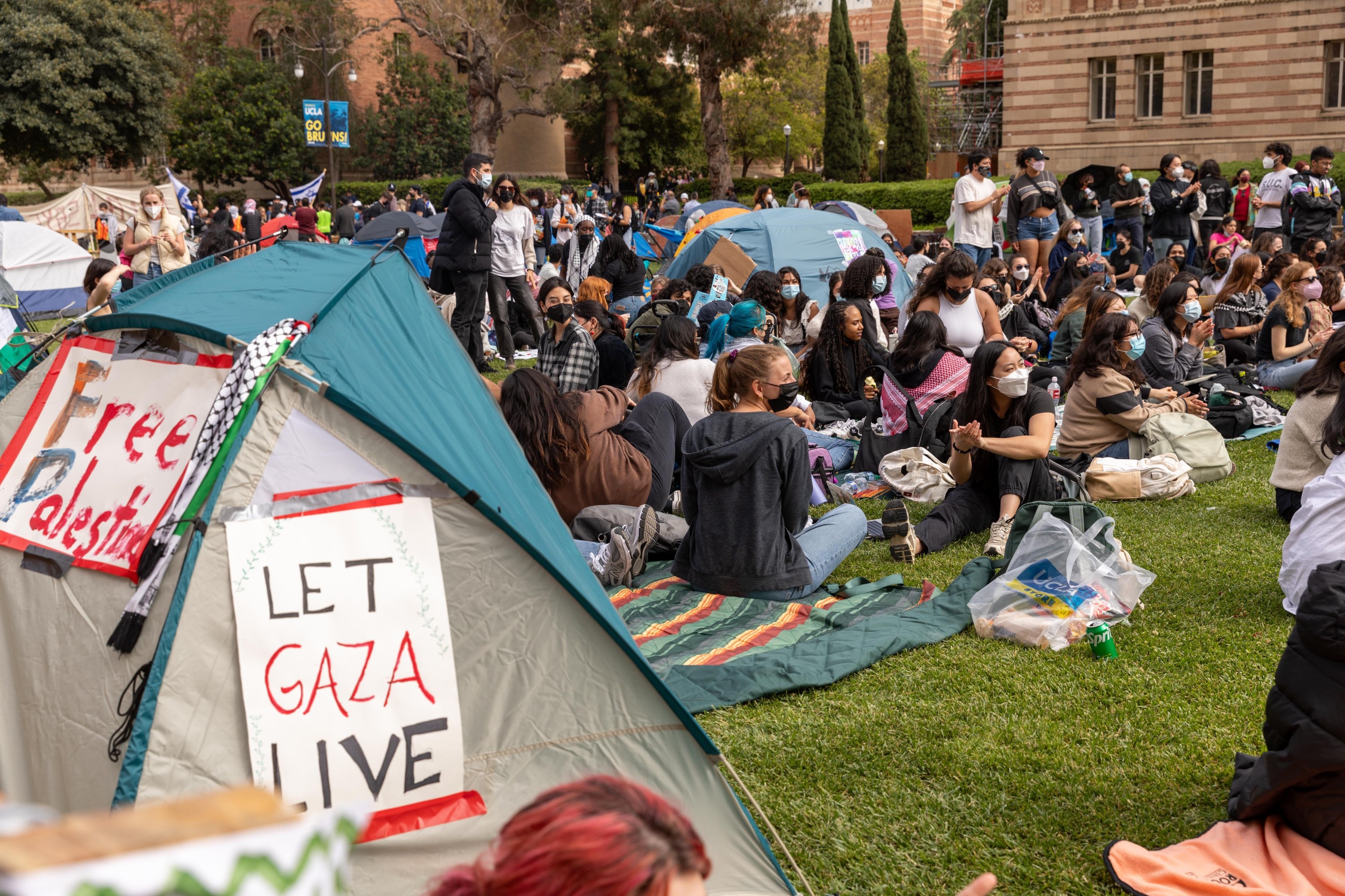 LOS ANGELES, CALIFORNIA – APRIL 25: A student encampment protest at the University of California, Los Angeles in solidarity with Palestinian people, in Los Angeles, California, United States on April 25, 2024. (Photo by Grace Yoon/Anadolu via Getty Images)