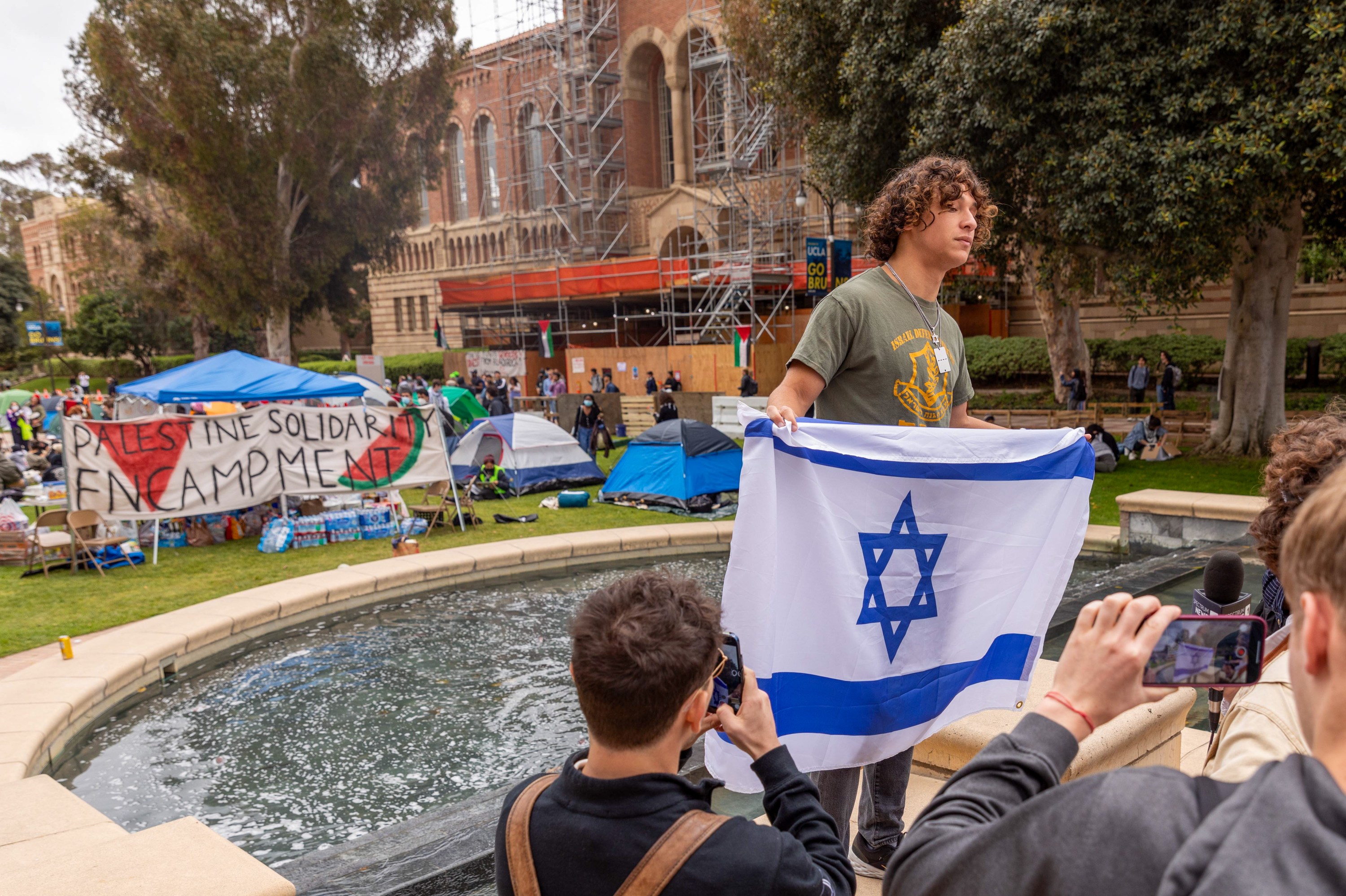 LOS ANGELES, CALIFORNIA – APRIL 25: An Israeli man, holding a flag, argues with a pro-Palestinian student as pro-Palestinian students gather to protest against Israeli attacks on Gaza at University of California (UCLA) in Los Angeles, California, United States on April 25, 2024. (Photo by Grace Hie Yoon/Anadolu via Getty Images)