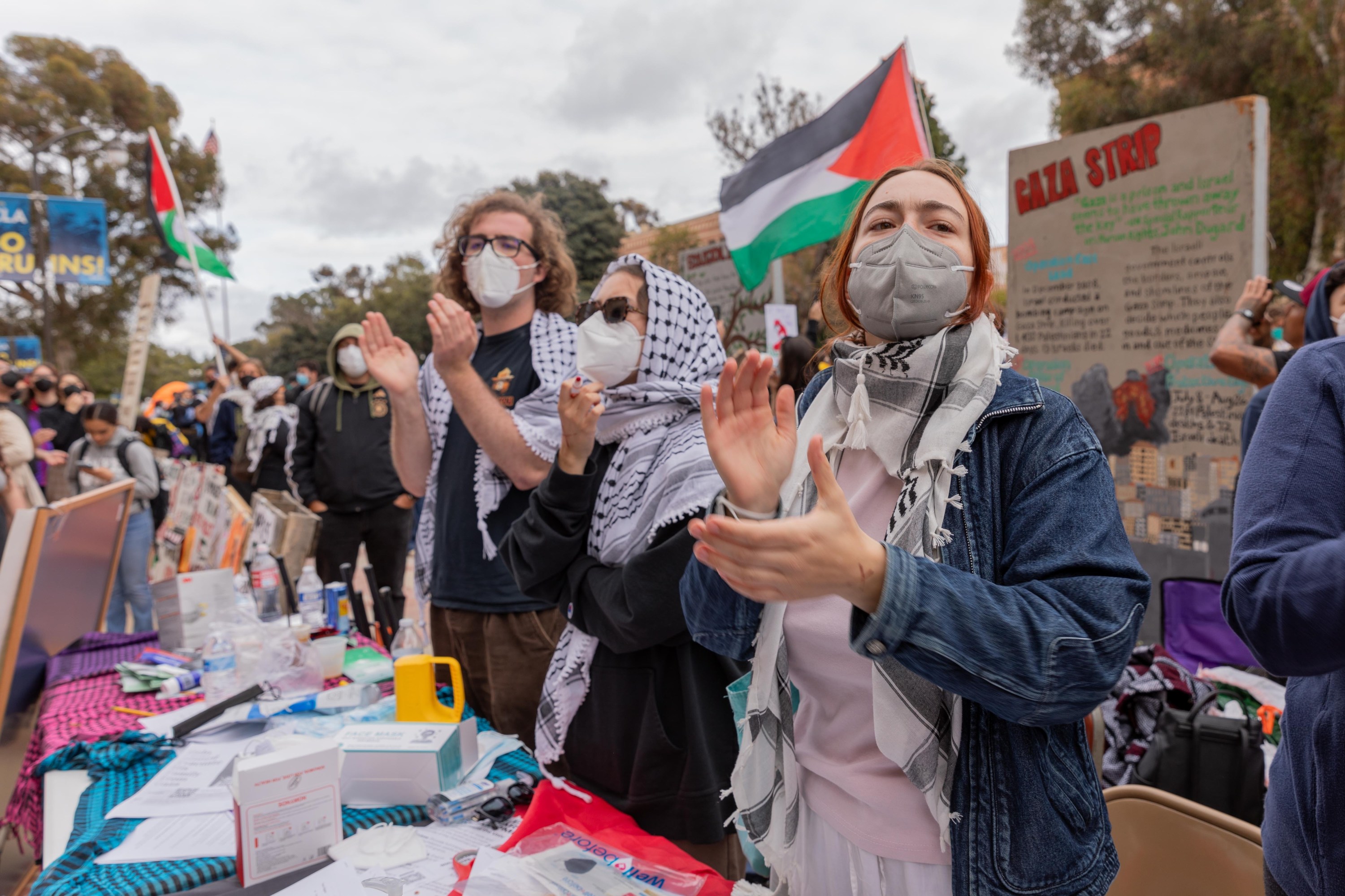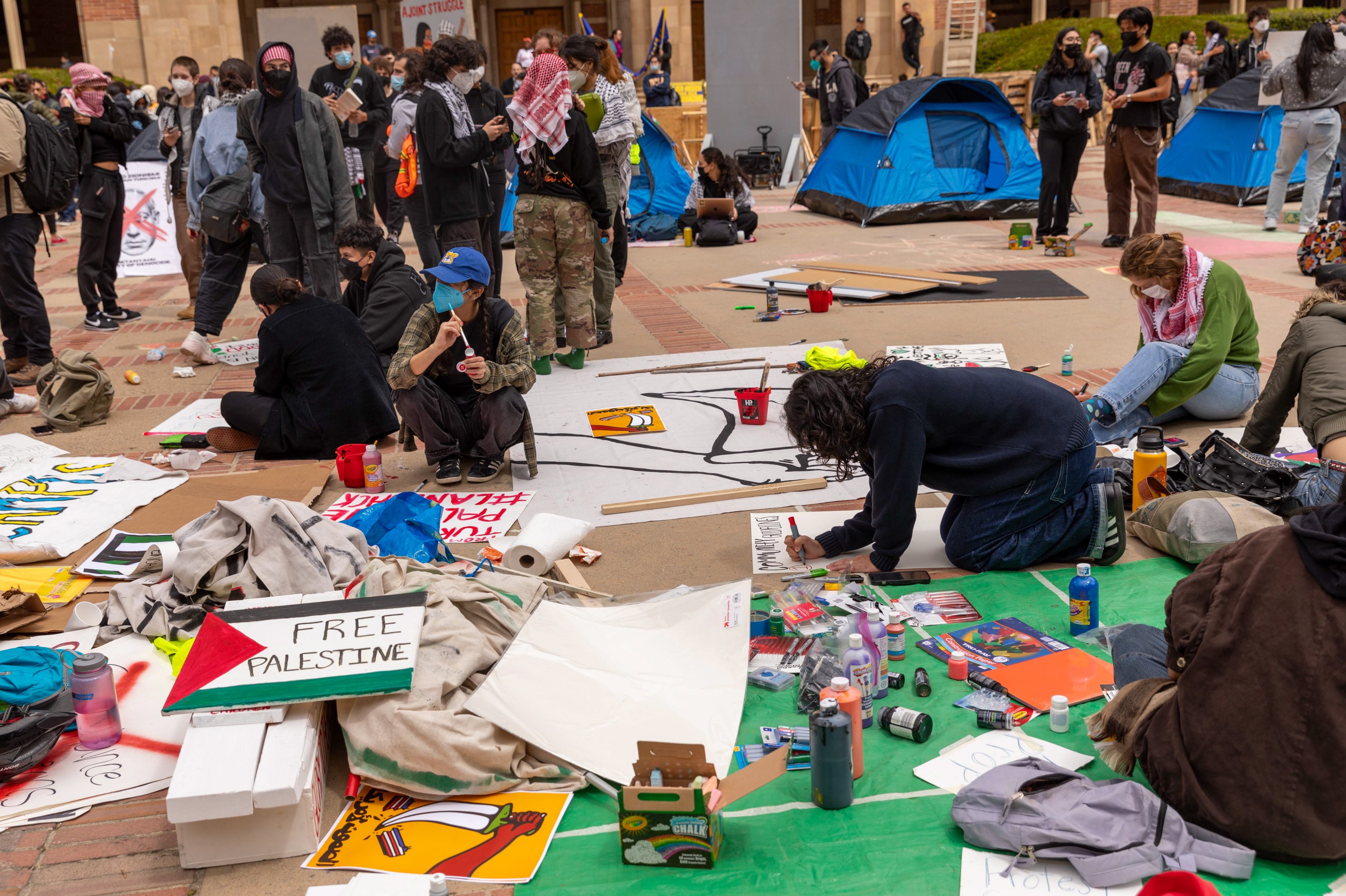 LOS ANGELES, CA – APRIL 25: Pro-Palestinian students gather at an encampment as they demonstrate at the University of California Los Angeles (UCLA) on April 25, 2024 in Los Angeles, California. Students protesting on campuses across US ask colleges to cut investments supporting Israel. (Photo by Qian Weizhong/VCG via Getty Images)