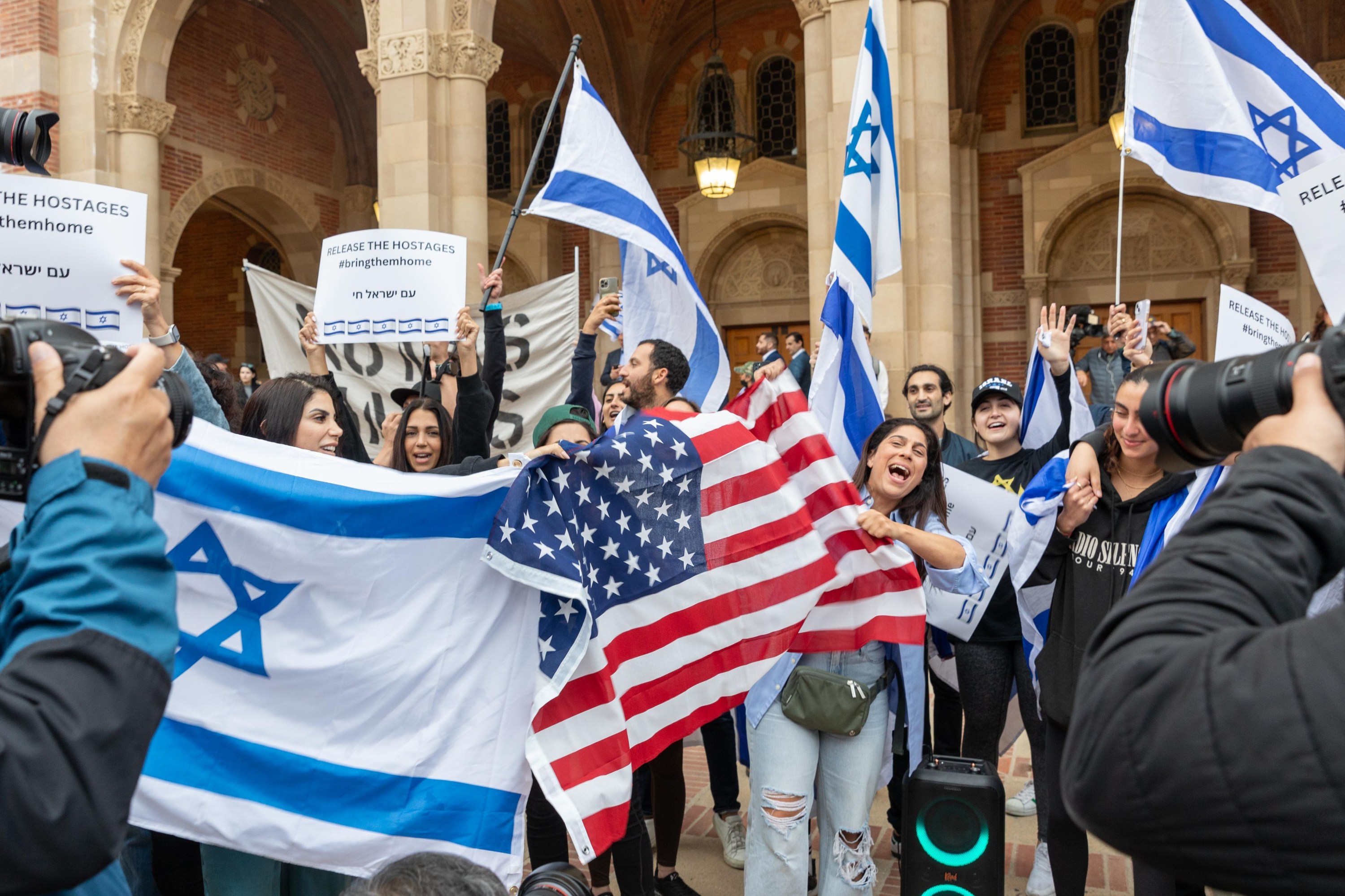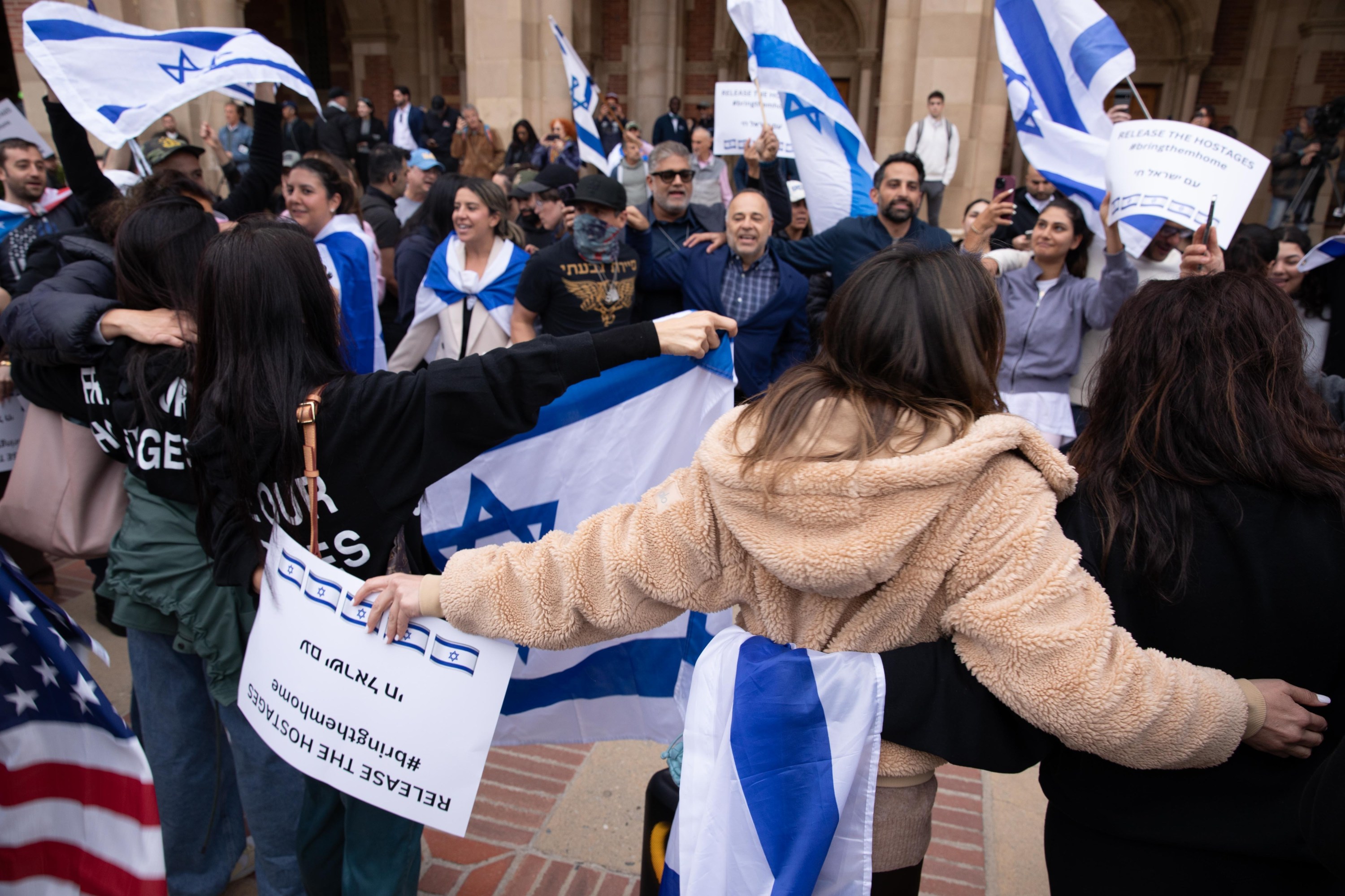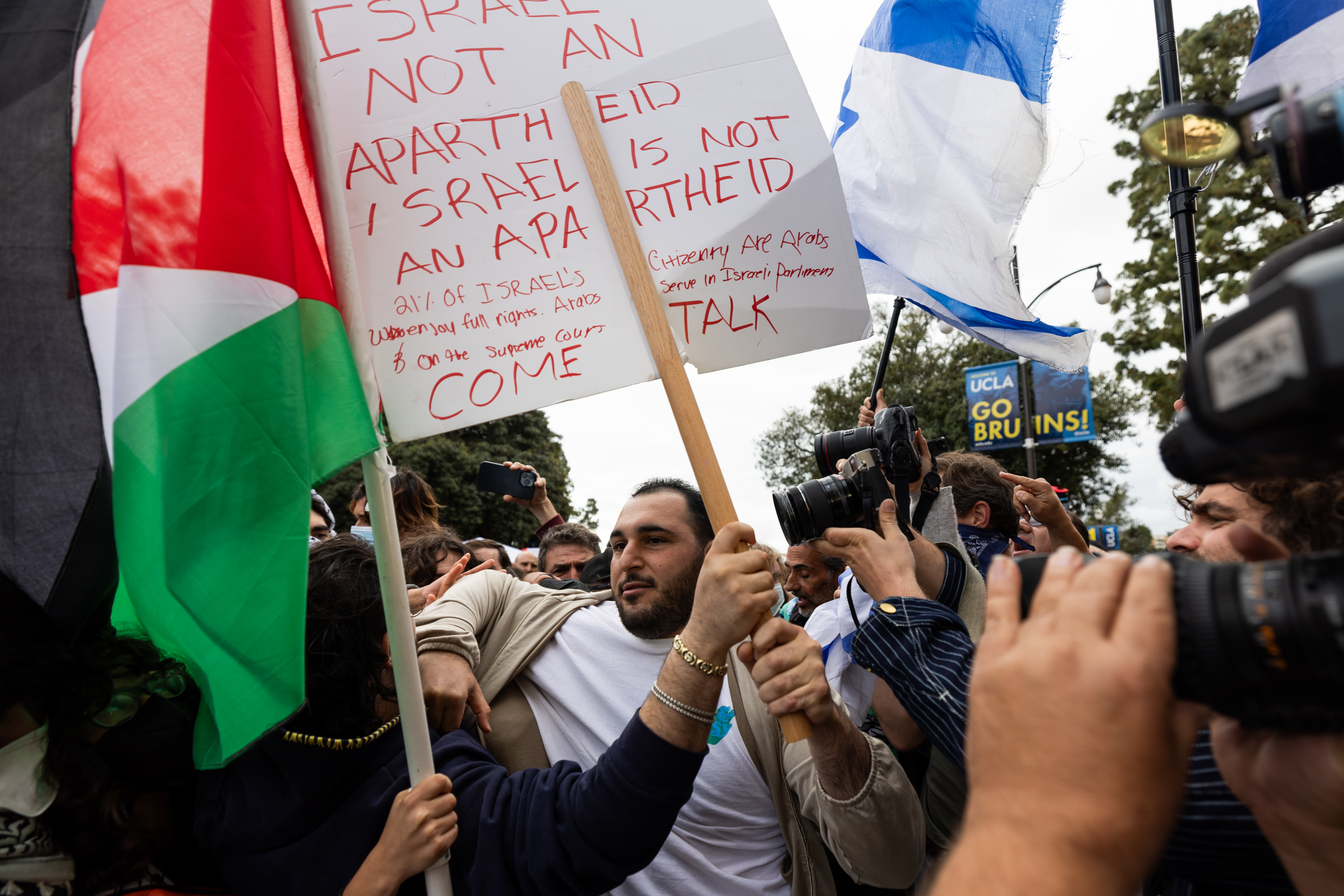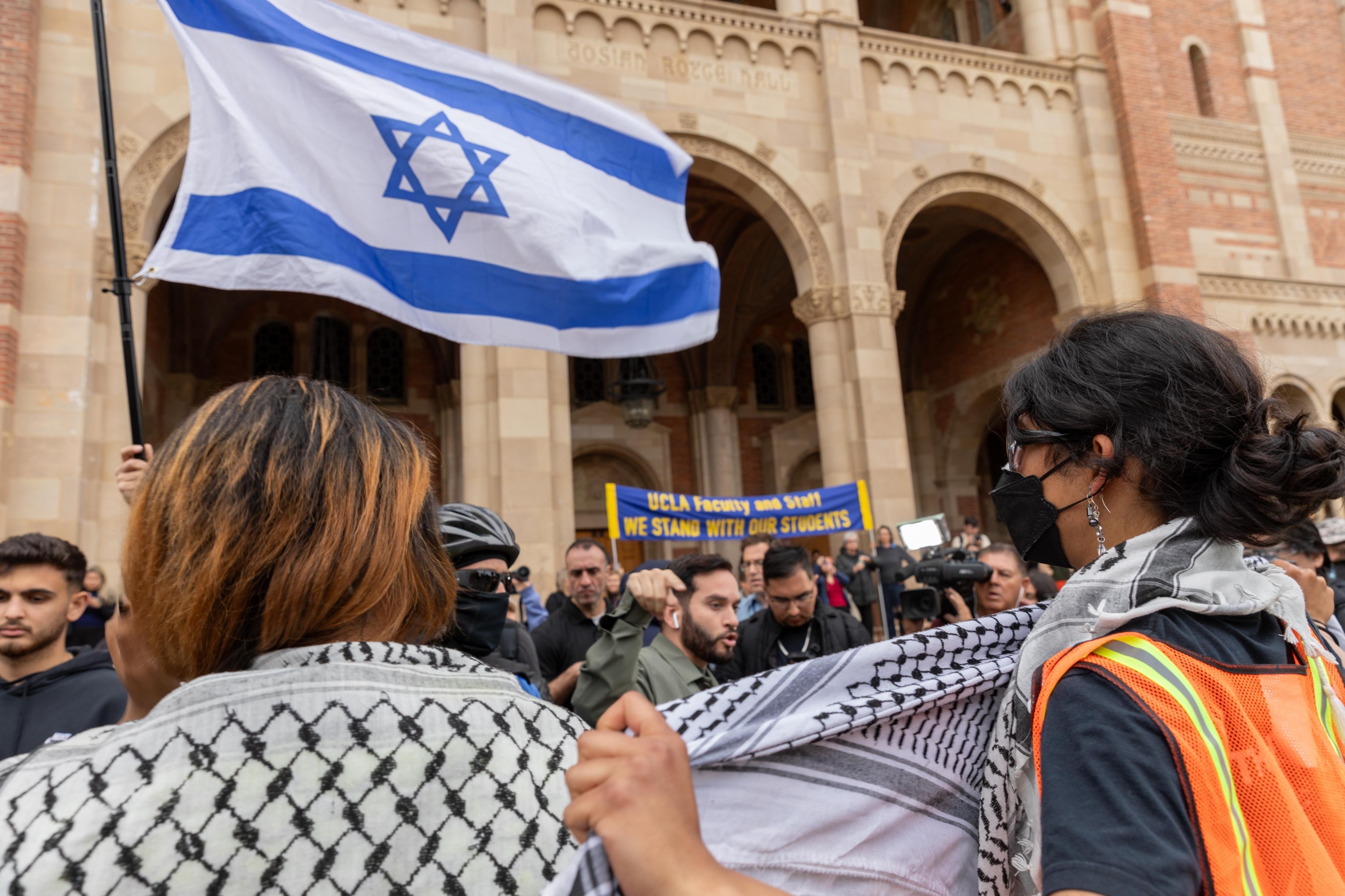 LOS ANGELES, CALIFORNIA – APRIL 25: A group of Israeli, holding flags and banners, face against Pro-Palestinian students as they gather to protest against Israeli attacks on Gaza at University of California (UCLA) in Los Angeles, California, United States on April 25, 2024. (Photo by Grace Hie Yoon/Anadolu via Getty Images)