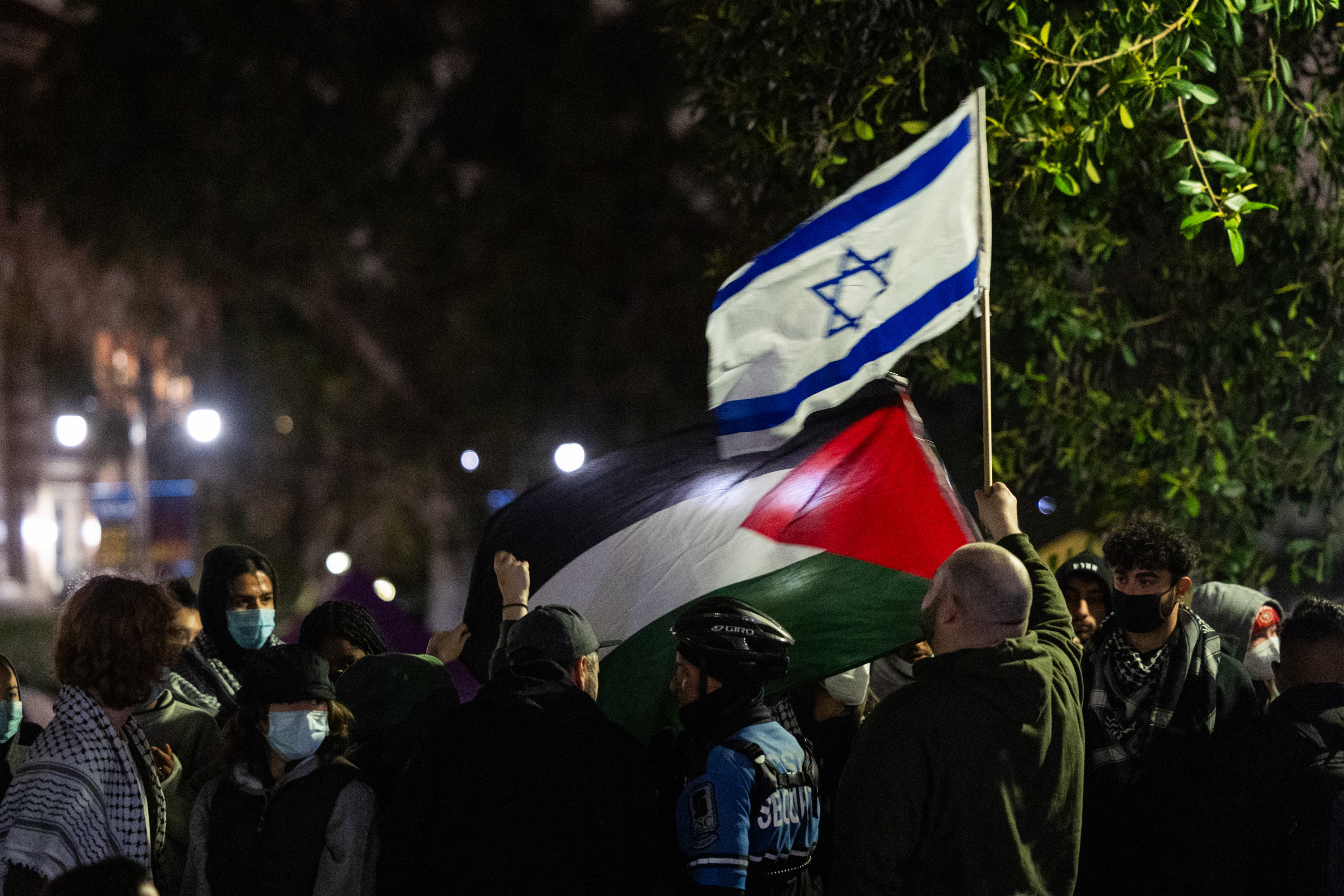 LOS ANGELES, CALIFORNIA – APRIL 25: A group of Israeli, holding flags, face against Pro-Palestinian students as they gather to protest against Israeli attacks on Gaza at University of California (UCLA) in Los Angeles, California, United States on April 25, 2024. (Photo by Grace Hie Yoon/Anadolu via Getty Images)