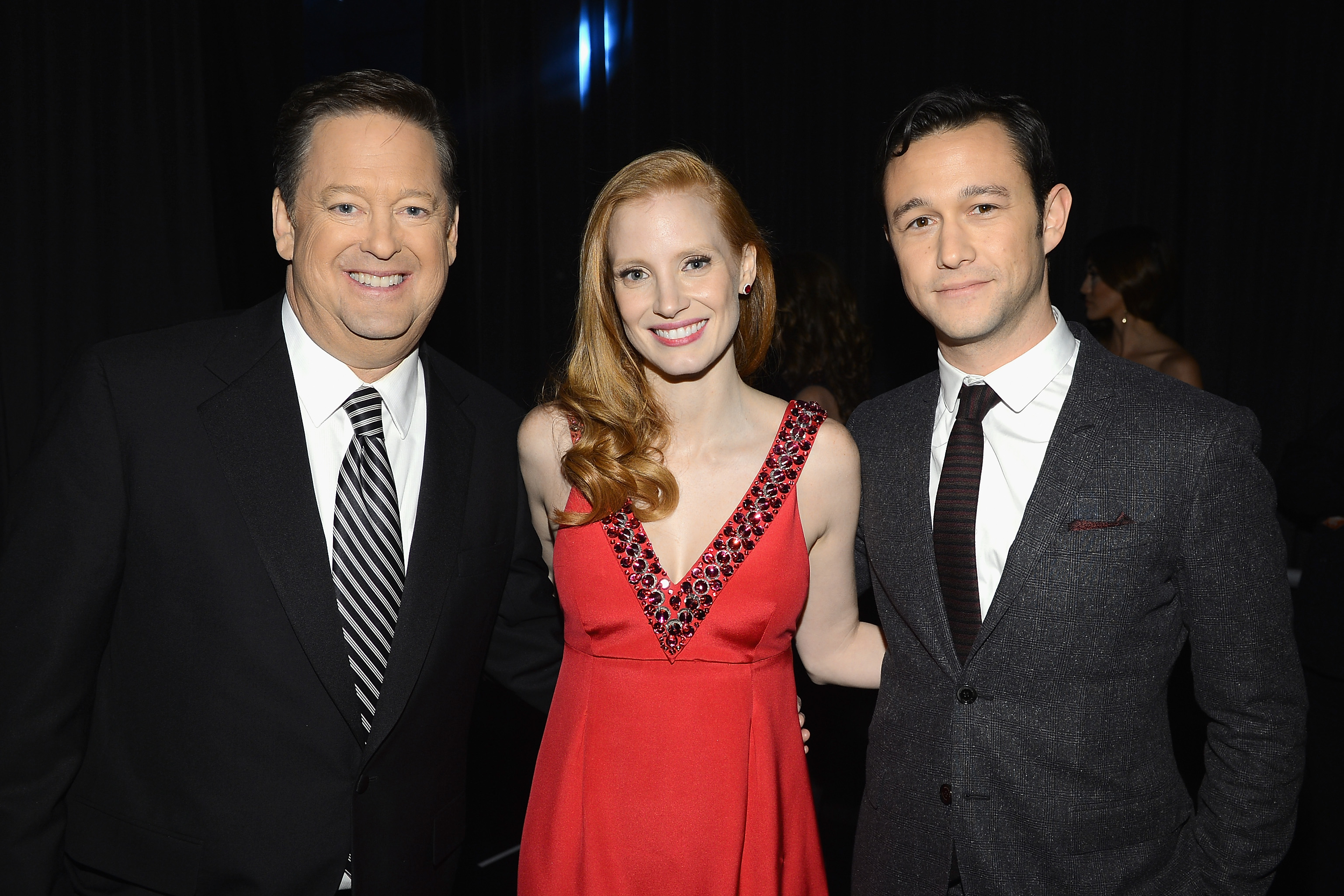 SANTA MONICA, CA – JANUARY 10: (L-R) Host Sam Rubin, actress Jessica Chastain and actor Joseph Gordon-Levitt attend the 18th Annual Critics’ Choice Movie Awards held at Barker Hangar on January 10, 2013 in Santa Monica, California. (Photo by Larry Busacca/Getty Images for BFCA)