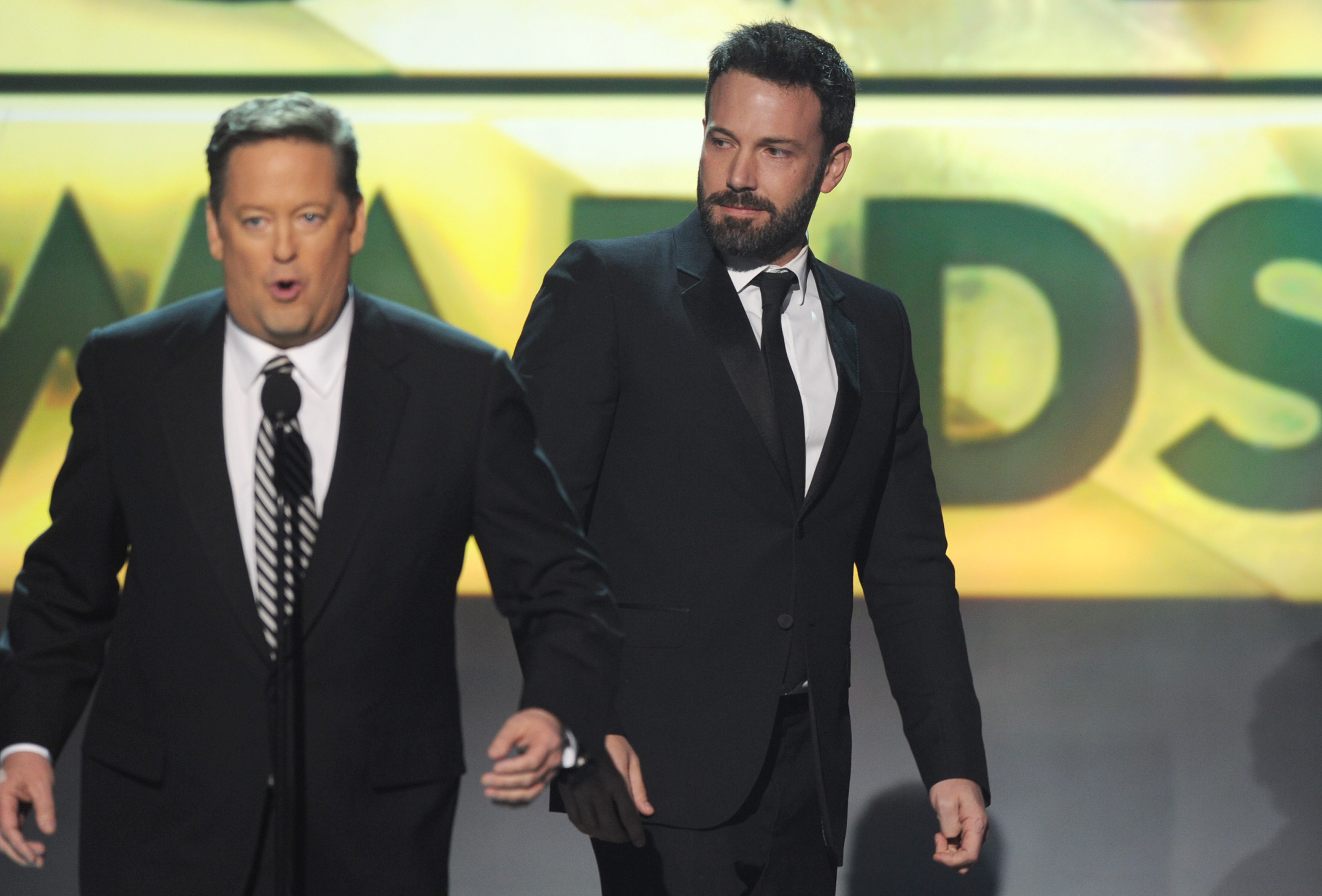 SANTA MONICA, CA – JANUARY 10: Host Sam Rubin and Ben Affleck onstage at the 18th Annual Critics’ Choice Movie Awards held at Barker Hangar on January 10, 2013 in Santa Monica, California. (Photo by Kevin Winter/Getty Images)