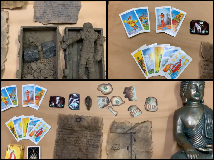 During the search of fortune teller’s business, Riverside detectives located a significant amount of cash, a voodoo doll, tarot cards, altars, religious and satanic type objects and a small live snake.