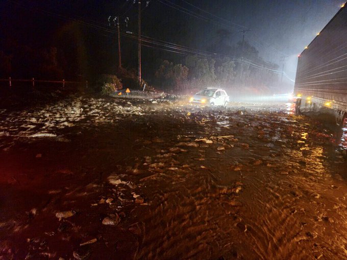 By Tuesday morning, about 6 to 8 inches of water, rocks and mud remained on the road, which was an improvement over the previous 3 feet of debris, according to KTLA’s Eric Spillman.