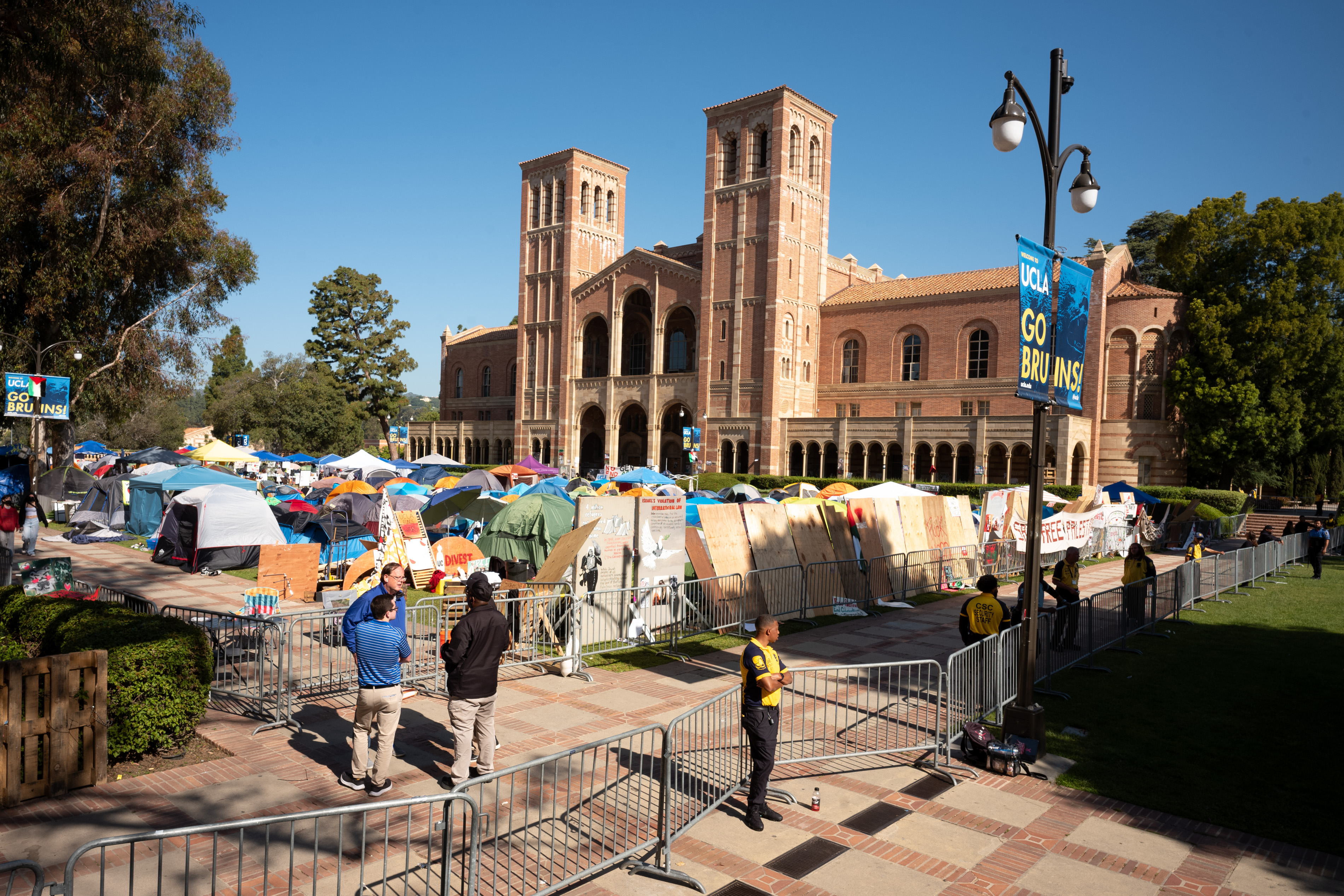 KTLA 5 News witnessed those guards attempting to deny entry to UCLA firefighters who wanted to inspect the encampment Monday morning, although they were eventually allowed inside.