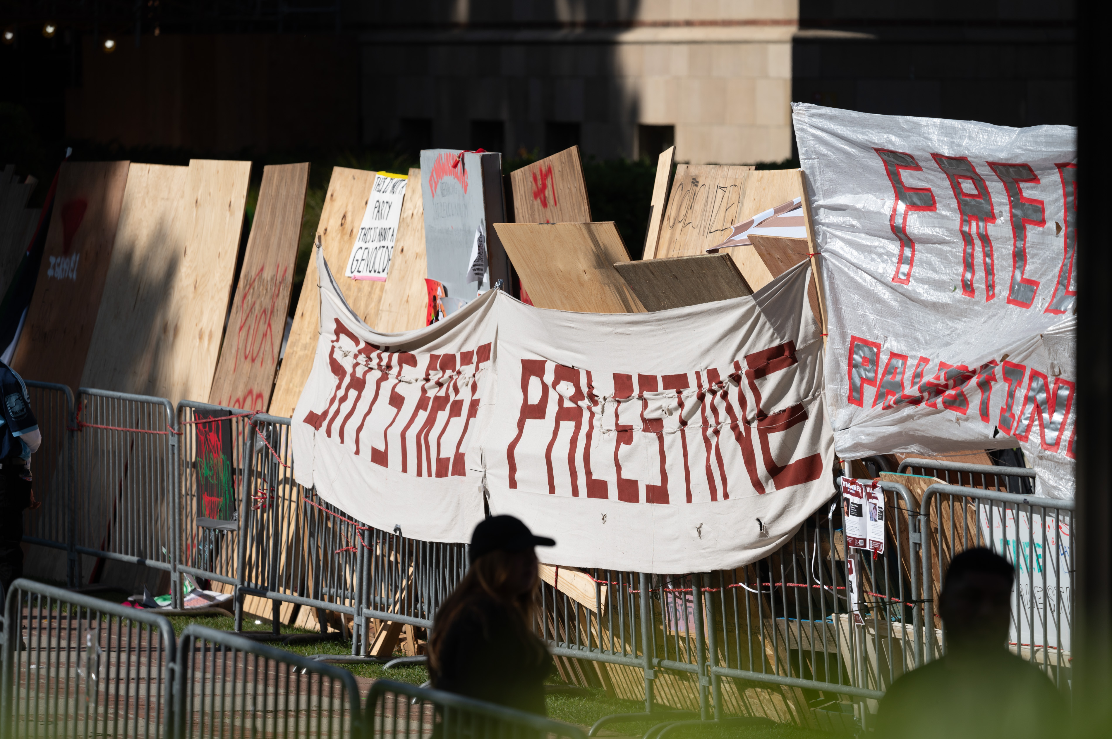 By Monday morning, the encampment at Royce Quad had grown to approximately 50 tents surrounded by wood and metal fencing. Protesters have appointed guards to block access to the public, including members of the media.