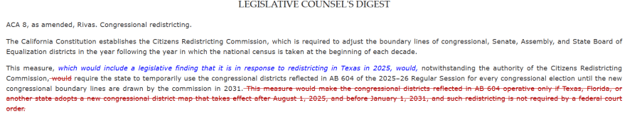 “This measure, which would include a legislative finding that it is in response to redistricting in Texas in 2025, would, notwithstanding the authority of the Citizens Redistricting Commission,