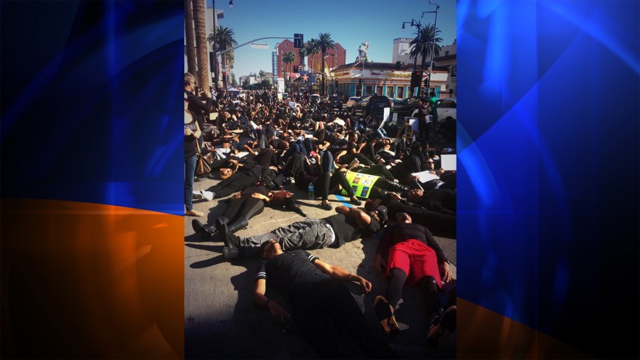 Protesters also staged a “die-in” at the intersection of Hollywood Boulevard and North Highland Avenue, where less than 24 hours earlier, police fatally shot a man after law enforcement officials said he did not comply with officer orders.