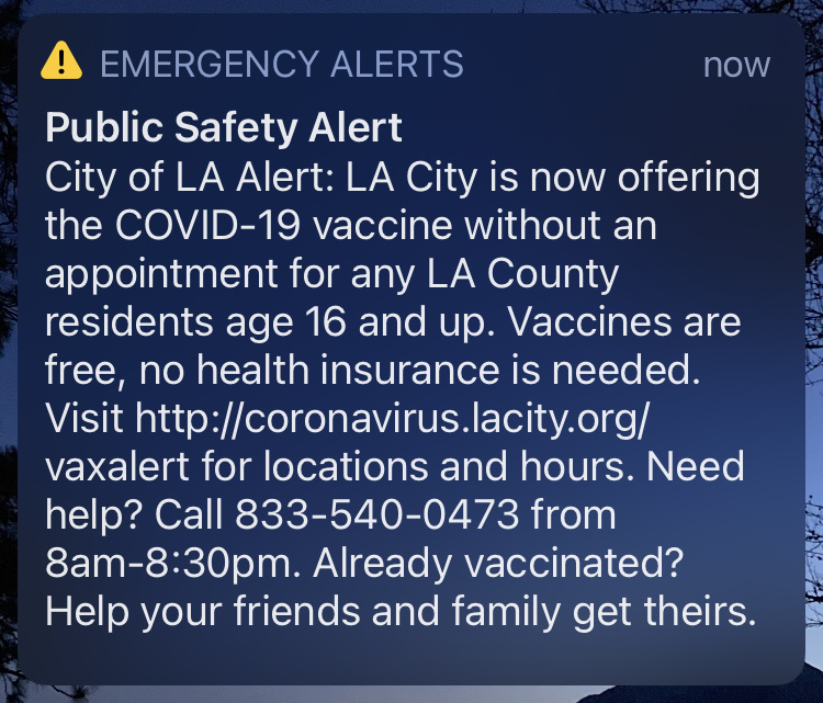 The message was sent shortly after 4 p.m. as a citywide emergency alert. It’s meant to spread information on how to get a coronavirus vaccine, which is always free, L.A. Mayor Eric Garcetti said in a tweet.