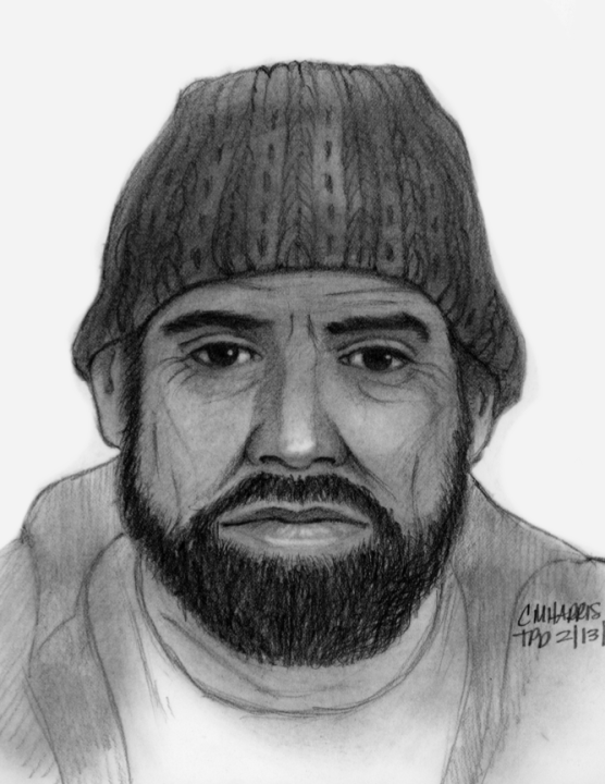 The victim worked on a sketch of the perpetrator with an artist from the Torrance Police Department. He is described as a male Hispanic, about 30 to 40 years old, with bushy eyebrows, a dark beard, dark hair and dark eyes. He was wearing a zip-up hoodie, dark pants and a beanie.