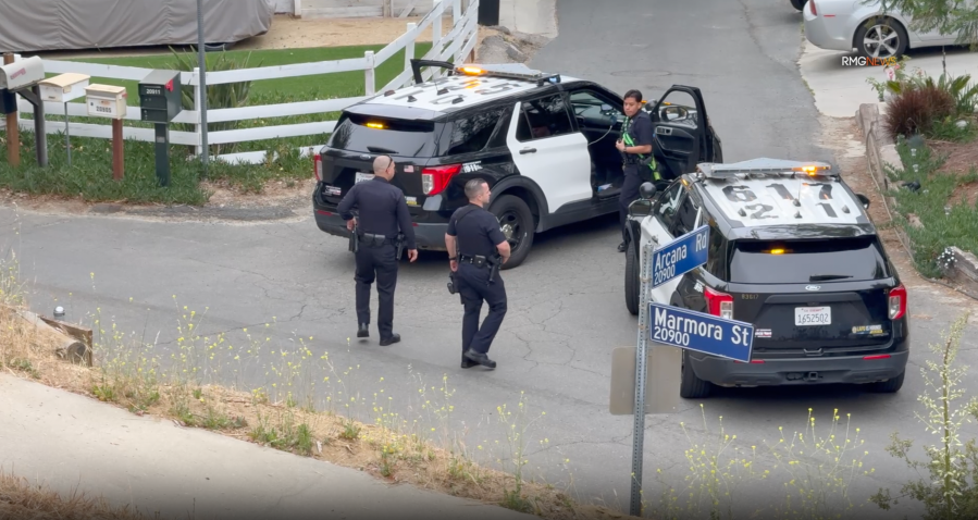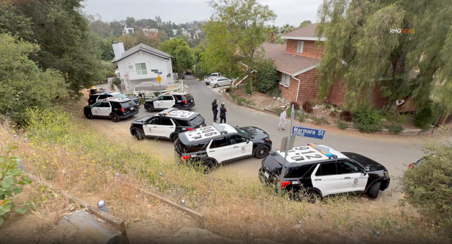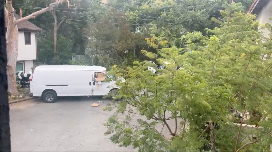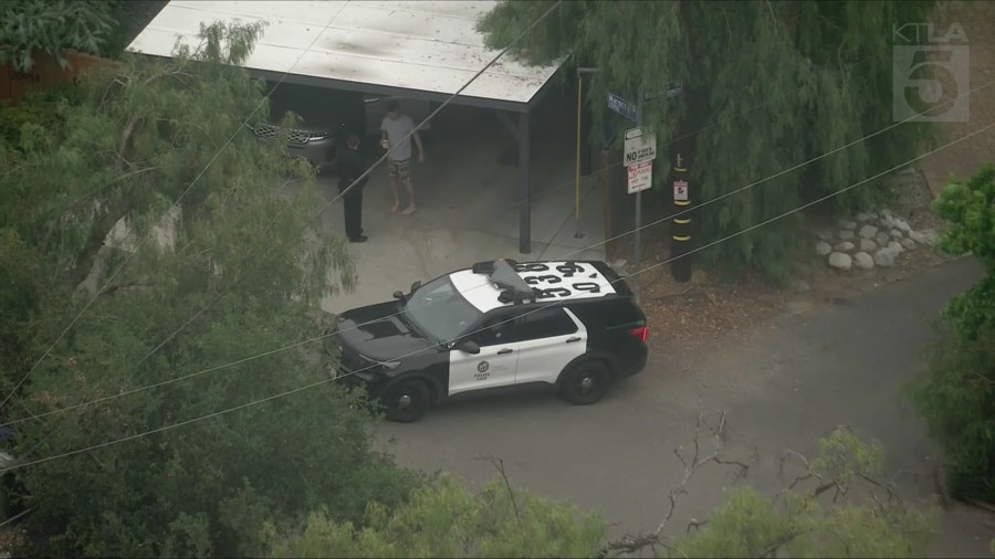 Sky5 was above the area where the van stopped around 8 a.m. but was unable to get a clear view of it due to tree cover and low clouds. Several squad cars were seen in the area; one officer was seen speaking with a man in a carport, and multiple LAPD airships were also seen monitoring the scene from above.