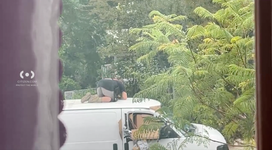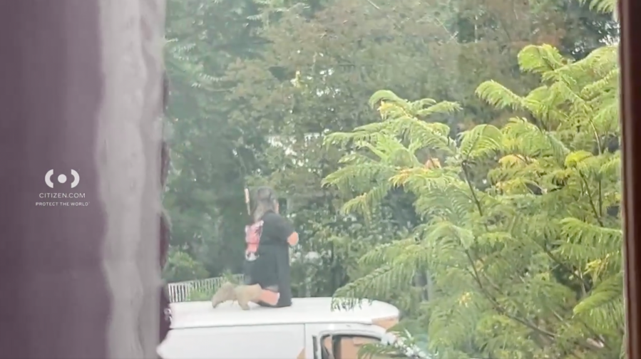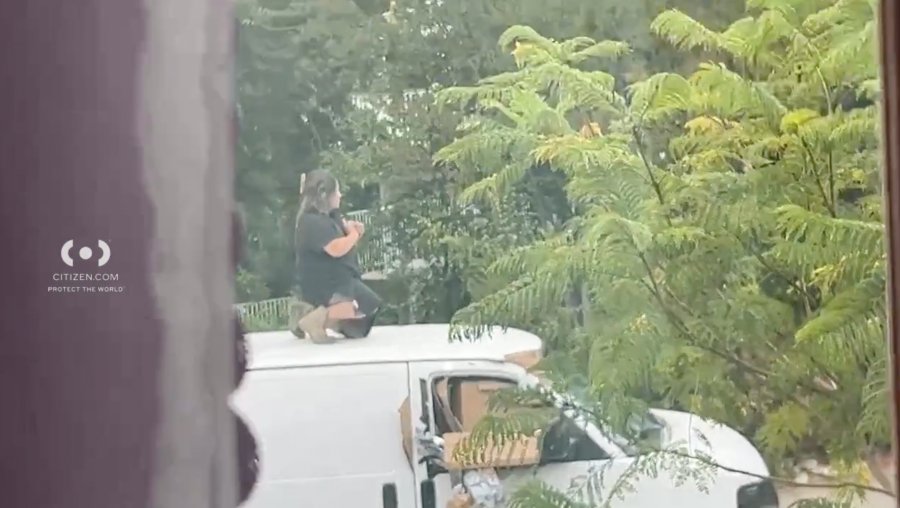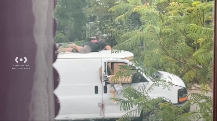 The woman was engaged in a standoff with police for about 45 minutes, witnesses said. Video posted to the Citizen App showed her standing and then kneeling on top of the van before lying down on her chest.