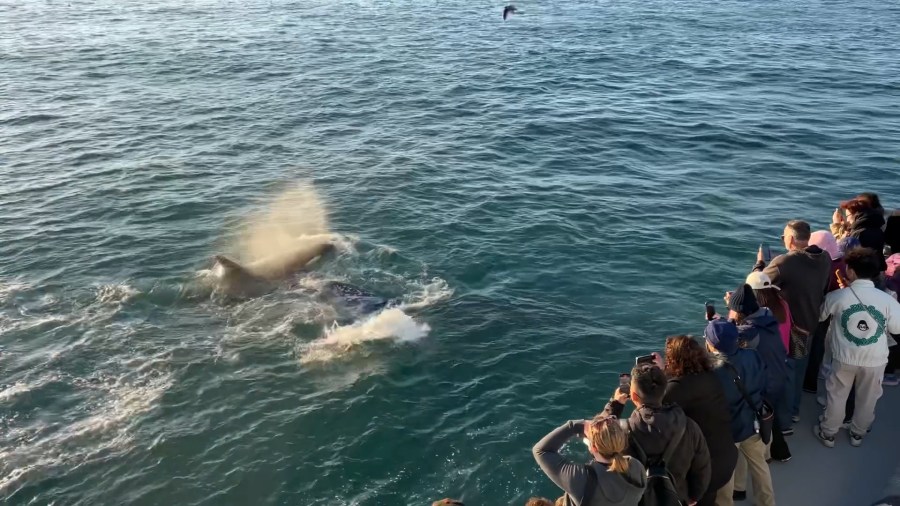A Harbor Breeze cruise out of Long Beach witnessed a mother gray whale fighting off a female Eastern Tropical Pacific orca near the Palos Verdes Peninsula in Los Angeles County, Assistant Port Captain & Spokesman Tyler Askari told KTLA.