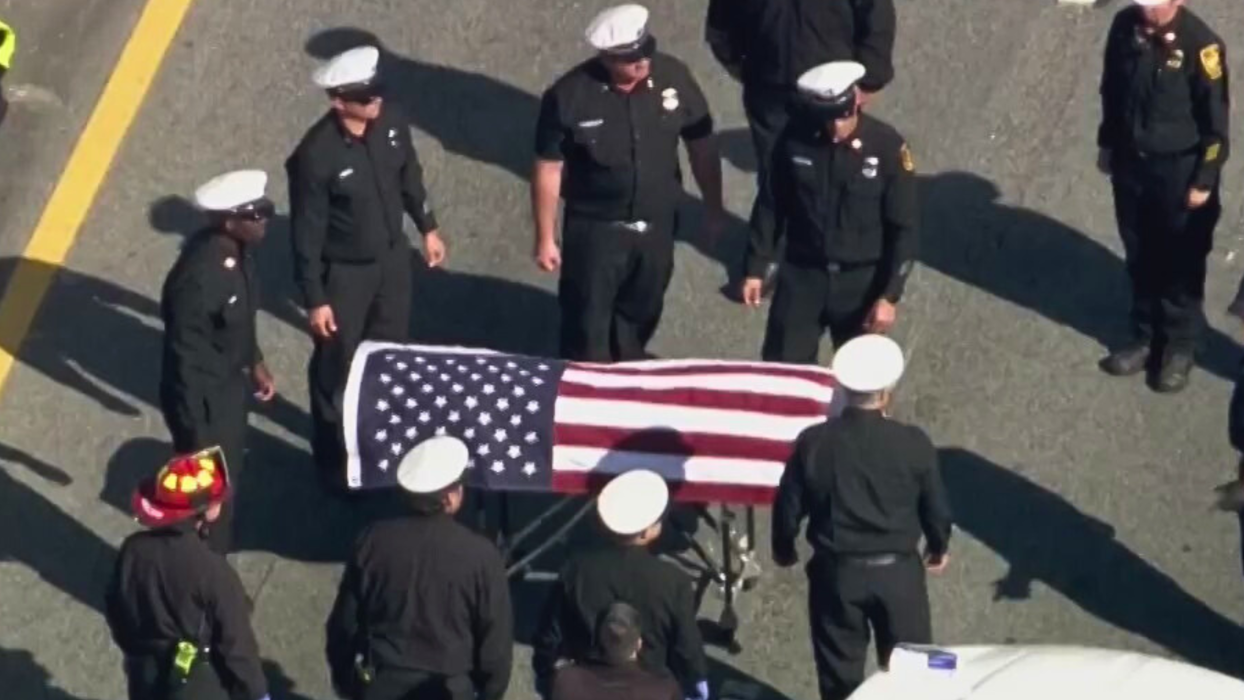 Sky5 was over the freeway as a procession made its way from the incident site to the Los Angeles County Coroner’s Office in Boyle Heights occurred around 10:30 a.m.